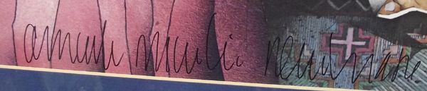 From the Nick and Suzanne Nicholas Collection we have a RARE 1986 ''AFTER MARIA'' SAN ILDEFONSO BY AMADO PENA, From the Nick and Suzanne Nicholas Collection we have a 1986 hand signed Amado Maurilio Pena, Jr. framed and matted print, measures 21.5''W x 22''H, Amado Maurilio Peña, Jr. was born in Laredo, Texas in 1943. He studied art and education at Texas A & I (now Texas A & M Kingsville), where he received his Bachelor's and Master's Degrees. Amado is a Mestizo of Mexican and Yaqui ancestry. His art celebrates the strength of a people who meet the harsh realities of life in an uncompromising land, and his work is a tribute to the Native Americans who survive by living in harmony with an adversarial, untamed environment. His artwork is inspired by places such as Canyon de Chelly, Spider Rock, Monument Valley, Enchanted Mesa, Acoma, and Black Mesa. These sites are part of an enduring landscape that speaks of the ancient heritage of a region that is now known as Arizona and New Mexico. Amado's artwork is defined by its bold color and form and dynamic composition. Through his art, he communicates his vision of a land, its people and their art. Amado Peña is recognized as an Artisan of the Pascua Yaqui Tribe of Arizona. This is a particularly high honor and one that he cherishes. He is dedicated to furthering the public's knowledge and interest in the Tribe, its art, its history, and its culture. A