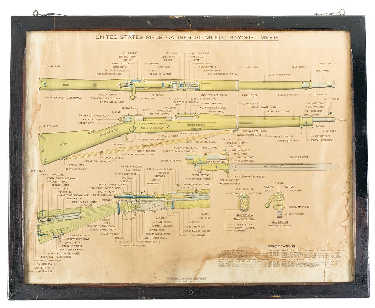 Original WWI instructional poster entitled: "UNITED STATES RIFLE CALIBER .30 M1903 - BAYONET M1905". This poster was prepared by the "Small Arms Division/Office of Chief of Ordnance/Washington D.C.". The 40-inch by 32-inch colored poster has top, side and cut-away views of the M1903 rifle and identifies all of the rifle parts and accouterments including the sling and oiler and thong case. Specifications for the rifle and .30 caliber cartridge are located on the lower right hand corner of the poster. The poster is complete with what appears to be the original fame. This is a rare Ordnance Department WWI instructional poster. This desirable poster would complement any Model 1903 or U.S. martial arms collection.