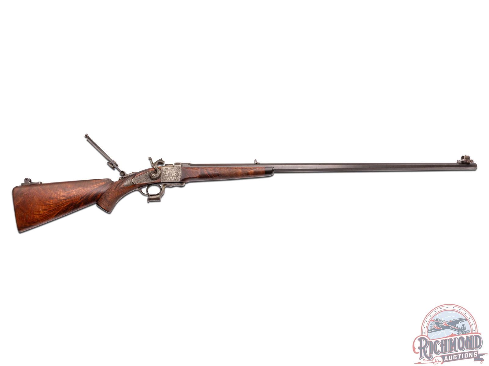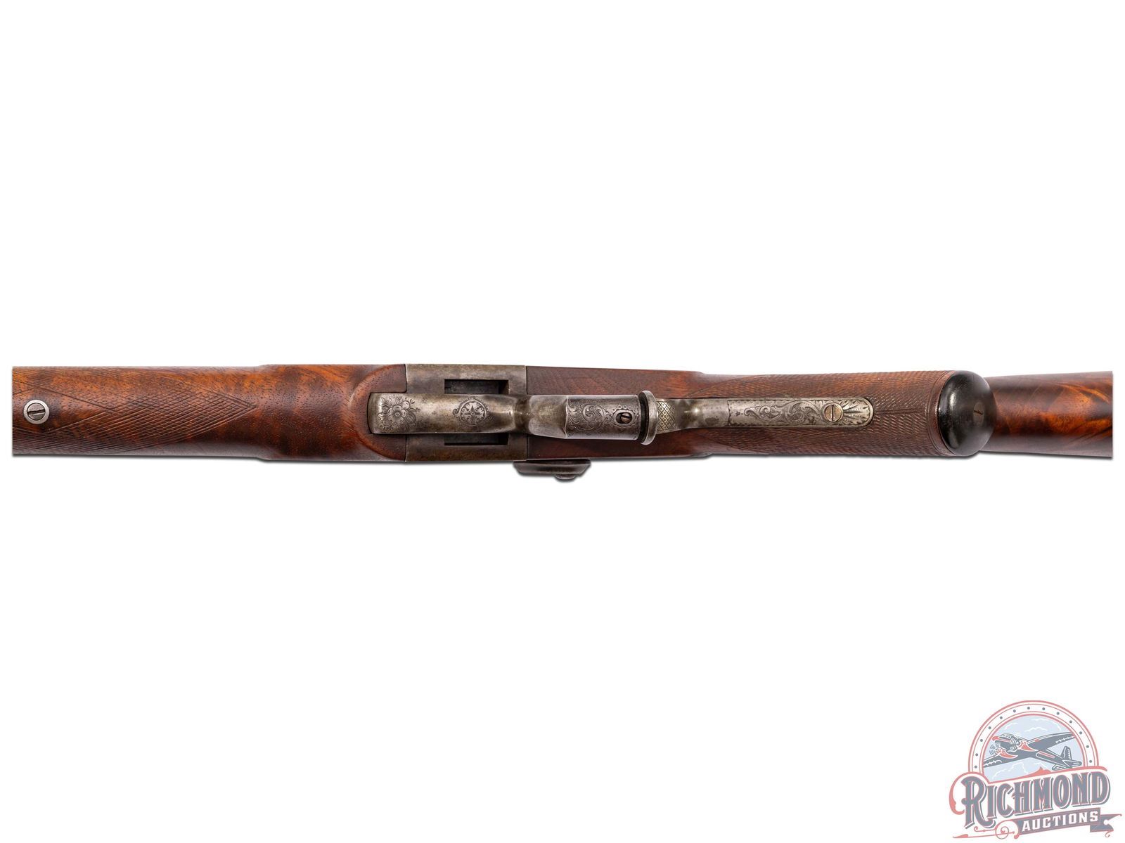This rare rifle was made circa 1877 by Frank Wesson Manufacturing in Worcester, Massachusetts. There are less than 25 of these rifles known. Rifle has 34" blued tapered octagon barrel in 44-100 Wesson caliber with Wind gage front and rear fixed sight. Tang is mounted with adjustable Vernier sight and there is also a "Heel" position on the butt for said sight. Barrel is marked in script "Frank Wesson Mfg. Long Range Rifle No. 1 Worcester, Mass.", also has number "21" stamped under forearm on barrel. Case-hardened full coverage floral engraved falling block action with "Bear" and "Deer" portraits on action panels, which could possibly be the work of Nimschke. Action has a single trigger and is marked on breech "Patented July 10, 1877" with side hammer and push button release lever. Fine checkered figured walnut pistol grip stock with horn grip cap and steel checkered shotgun type butt plate. Matching checkered "Alex Henry" style walnut fore end with ebony cap. A rare and hard to find rifle for the single shot collector. J.T. Livengood Collection. CALIBER: 44-100 Wesson. S/N: 21. FFL STATUS: Antique.