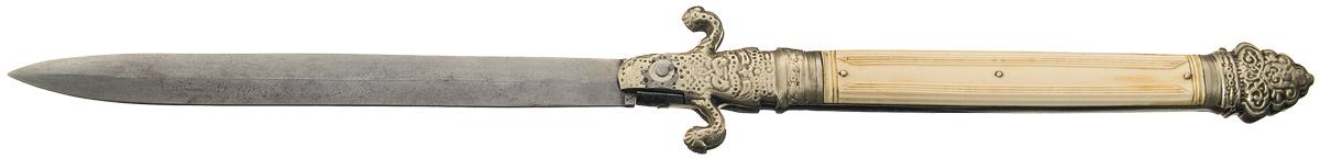 This is a French bowie knife with a 9" long folding blade, making this bowie very rare for its size. There are no maker markings. Ornate lead and tin turned down guard and bolsters. A decoration used during civil war era. Fitted with grooved ivory scales secured with three rivets. Massive overall length of 19 1/2".