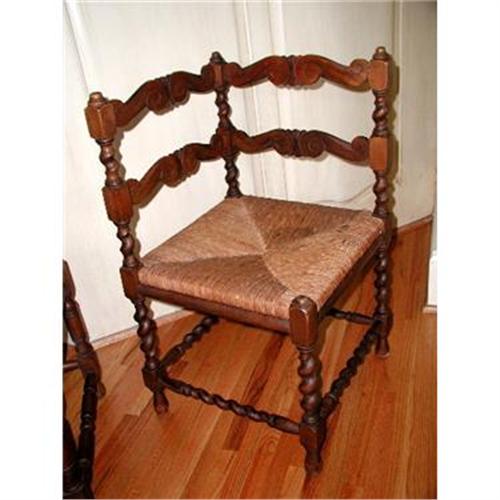 Unique and rare French walnut corner chair from Provence is hand carved with floral design on both backs.Barley twist legs with superior support make this C.1900 chair very sturdy. The comfortable rush seat is still in perfect condition.Measures 29.5H X 17D X 17W.
