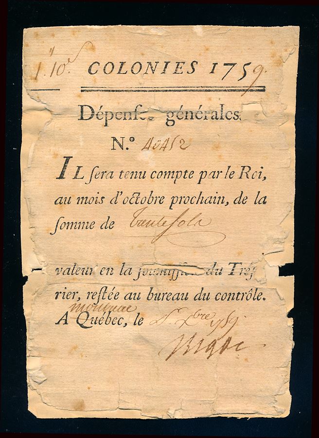 French Regime, Ordinance or Treasury Note, 30 Sols, 1759, #40452, with printed "Quebec" crossed out and manuscript "Montreal". Body of the note is Good, with pieces missing from the border and internal tears and holes. Backed by paper or thin card stock. Rare.