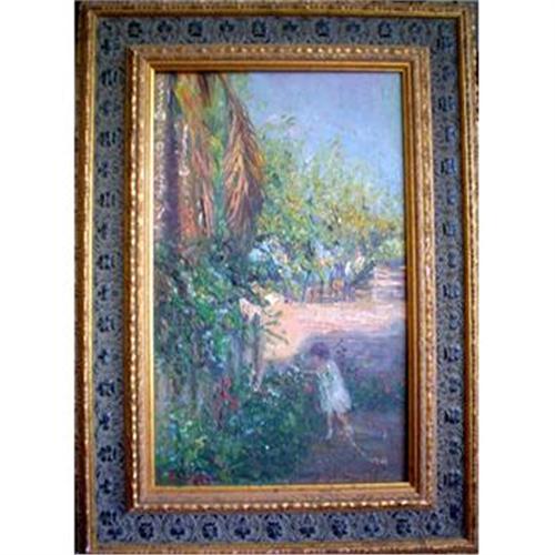 This is a very rare painting with a quality that you'll never find in any other place but the Bureau Art Gallery. It is from the French School showsing the image of a girl walking in a beautifull yard. The Bureau Art Gallery (20 years in business) and our experts can assure you the quality of the painting!
