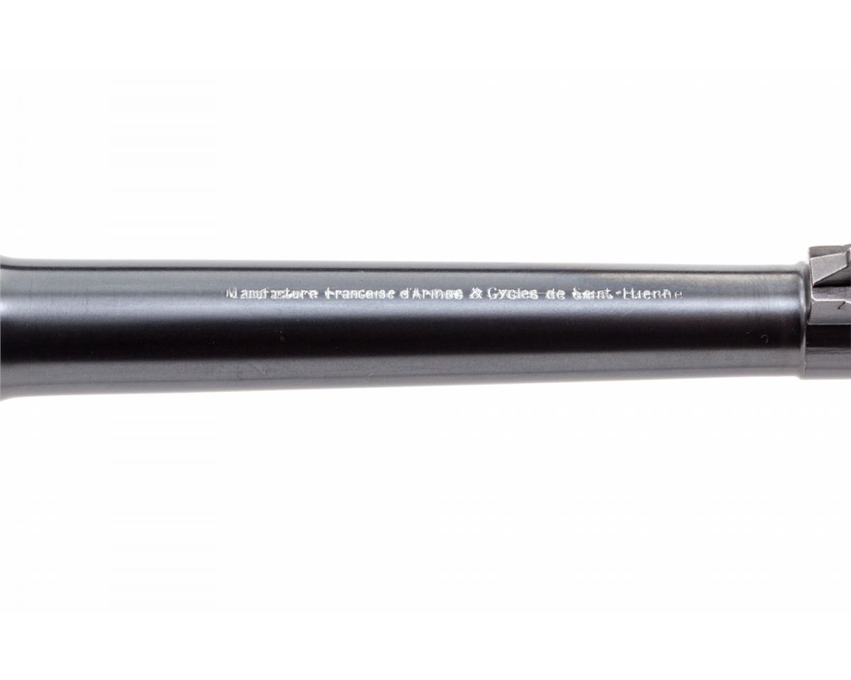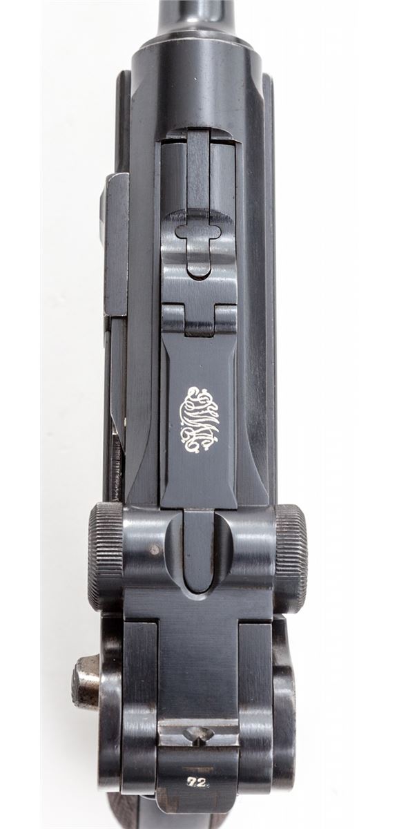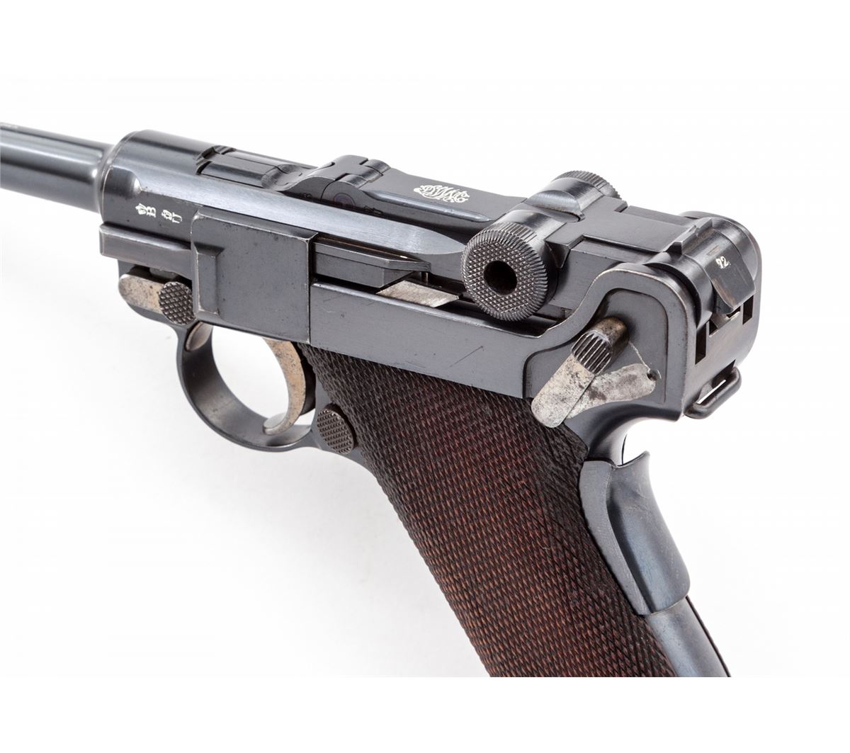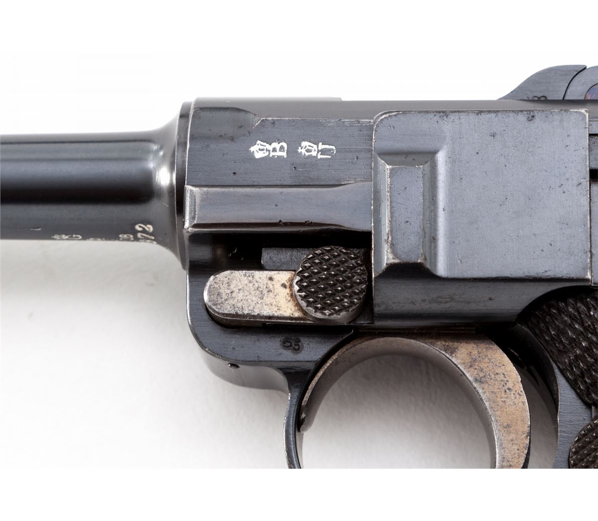 Rare French marked 1906 Commercial Luger, #45872, .30 Luger cal., 4-3/4'' barrel, blue finish with straw small parts, factory checkered walnut grips, and one unmarked nickel-plated magazine with wood base. Top of barrel marked ''Manufacture Francaise d'Armes and Cycles de Saint-Etienne'', chamber is blank, toggle marked DWM, serrated safety with lower portion polished bright. Extractor marked ''Geladen'', with BUG proofmarks. These pistols are considered quite scarce with less than ten known. Condition is excellent retaining approx. 98% lightly thinning blue. Straw parts show carbon spotting and thinning at high edges, more pronounced at thumb safety. Grips with mild flattening and oil darkening. Action is crisp, bore is fine. Est.: $4,000-$6,000. (C&R/PPT) (John Siroonian estate)