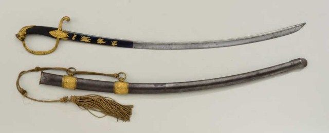 Rare French restoration period General Officer’s pattern sabre circa about 1814 in very good to near fine original condition with blued gilt blade and original scabbard. The grip is finely checkered ebony and pommel shows a lion. The hilt is decorated in florals and shows a knight’s sword in wreath at center. The hanger’s on scabbard show Three (3) Fluer D’ Li”s with stands of arms signifying the restoration for the monarchybefore Napolean was defeated at Waterloo and made in period that was less than two years. The blade shows 80%-90% plus original blue and makers name is under guard but we cannot read it. The scabbard shows patina with mostgilt on mounts. A very, very rare sword. Est.; $5,000-$10,000