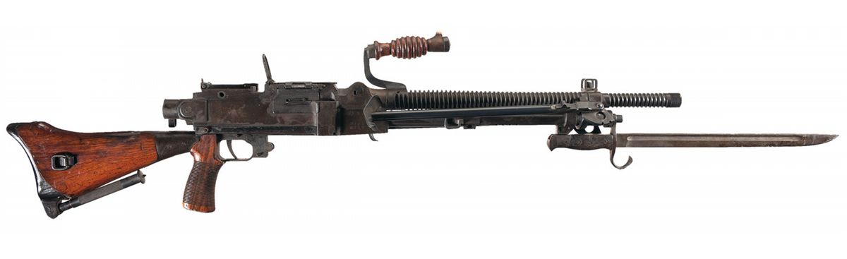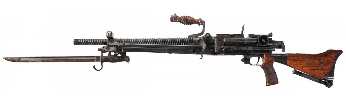 This is an excellent example of a very desirable and fully operational WWII Japanese Type 99 LMG. This model was developed in 1939 as a replacement for the Type 96 LMG and fired the new, heavier 7.7mm Japanese cartridge. These weapons proved to be very successful throughout the war by all the Japanese forces on all the Japanese held islands and mainland China. They are identical to the earlier Type 96 in configuration and function, but they have a forward mounted folding bipod, a new, finned quick change barrel with a top mounted carrying handle and a fully adjustable mono-pod attached to the underside of the buttstock. These were a very well made machine gun that featured all machined parts with a hard wood buttstock and pistol grip. The right side of the receiver has the four intertwined cannon balls of the Kokura Arsenal, next to the Arsenal inspectors mark with several Kana markings/the series mark/serial number over the show a date of 17.7, (July 1942). It is complete with an original WWII Japanese type 30 hook bayonet as made by the Kokura Arsenal, and the barrel is missing the flash hider. As noted this weapon is fully operational and registered with the BATFE as a NFA/Class III weapon. Included is approximately 60 rounds of ammunition on two stripper clips.