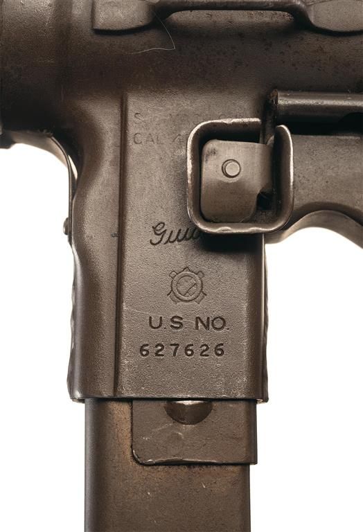 This is an excellent all original WWII US Army contract M3A1 SMG as manufactured by the Guide Lamp Division. These were developed in the 1941-1942 time frame as a substitute for the M1 Thompson SMG which required a significant amount of manufacturing time and cost to produce. This is a late production model that was manufactured originally as a "M3A1" SMG. The left side of the magazine well is marked "SUB-MACH. GUN/ CAL. 45 M3A1/Guide/Crossed Cannons (Ordnance proof)/U S NO 627626". As noted this late production model has the combination ejection port cover/integral safety on the right side. It has a fixed front and rear sight and is fitted with a retractable wire stock complete with an original oiler stored inside the rear pistol grip and two 30 round stick magazines. There is a very small import mark of "INTER AMERICAN SAC.CA." on the left side behind the front sling loop.