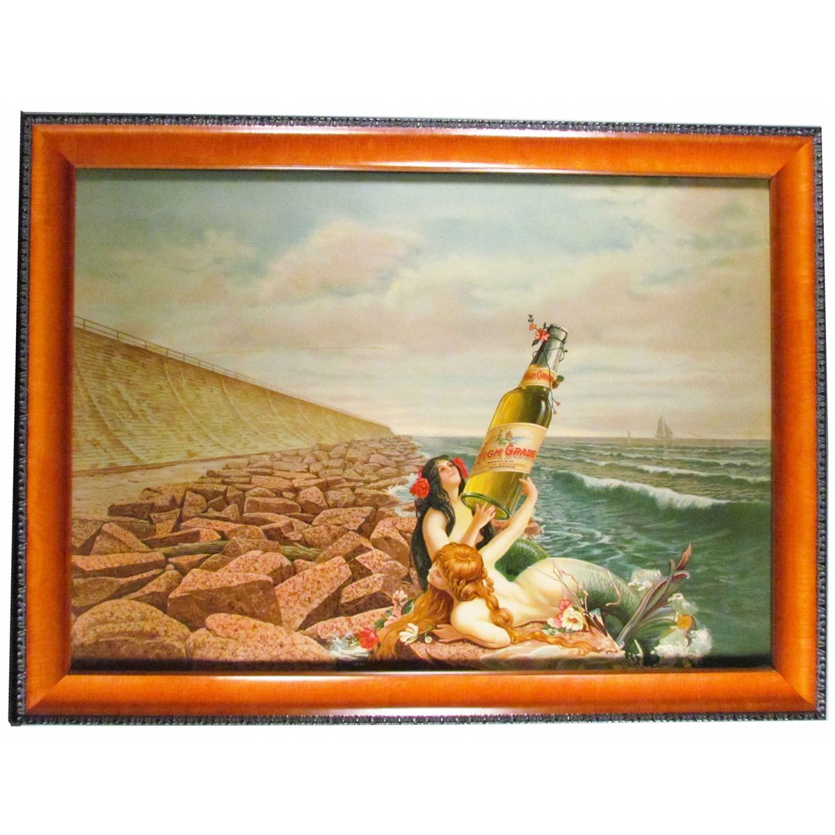 Rare Galveston Brewing Company Sign. High Grade Beer. Copyright 1908 by Galveston Brewing Company, Galveston, TX. Depicting two mermaids. The only second one we have ever seen. Repaired creases in sky otherwise excellent condition. Framed under glass. 28 X 20 inches image only.