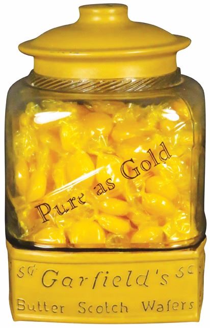 Rare Garfield's Butterscotch Wafers Store Display Jar with embossed tin trim and lid. Excellent condition. No chips or cracks. 5 1/4 X 9 5 1/4 inches.