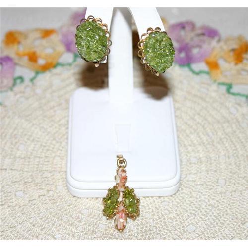 This is an unusual 1950s Vintage Oviline & Coral Pendant and Earring Set created in Hawaii from Olivine extracted from Volcano Lava. The Pendant is set in a fancy open-back setting in the shape of Navettes with Shards of Coral running down the center bordered by large pieces of Oviline on each side. Measuring 1 1/2 inches long and 3/4 inch wide. The matching Oval Shaped Earrings are set in dog-toothed fashion with thick clusters of Oviline and set on a closed-back fancy frame, measuring 1 inch long by 3/4 inch wide. Locals gave this stone the name Hawaiian Diamond because of the way it sparkles! Produced in the 1960s-70s by a company called Lava Fantasia and complete with its original packaging marked Lava Fantasia A Touch of Hawaii. Chain not included.