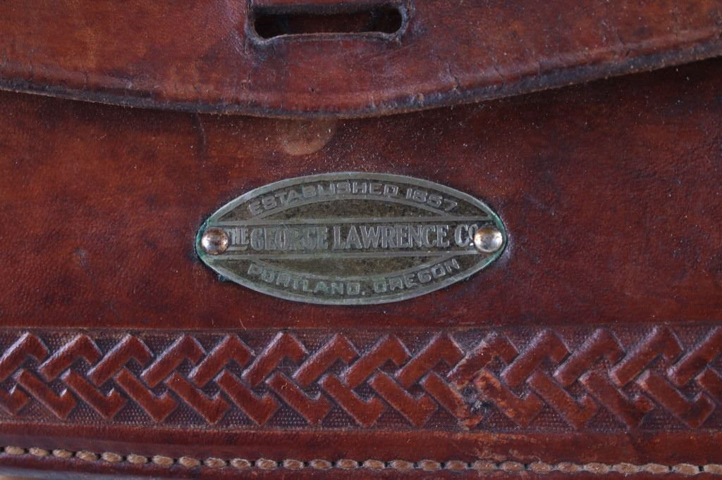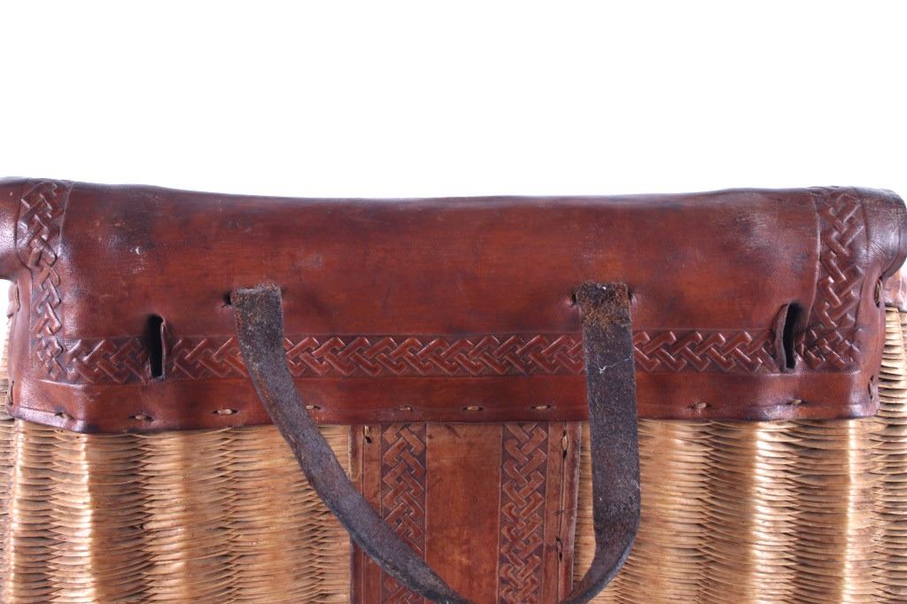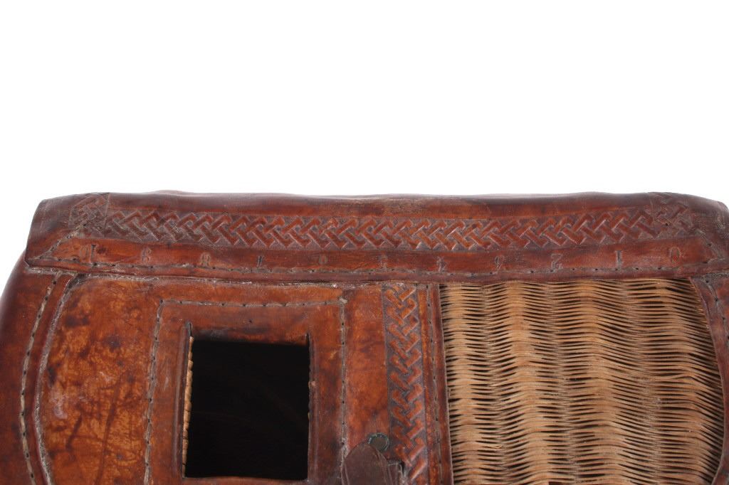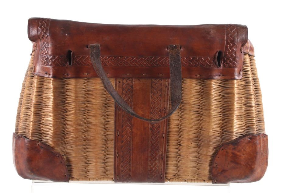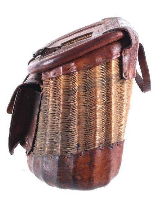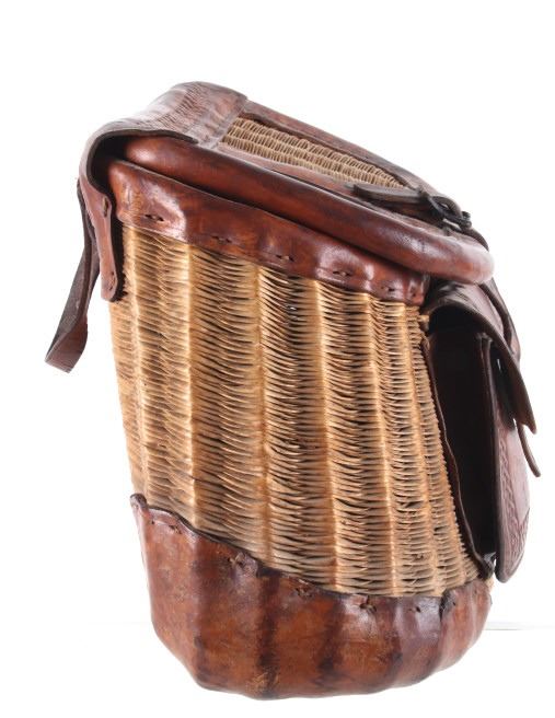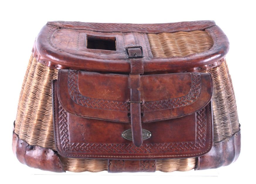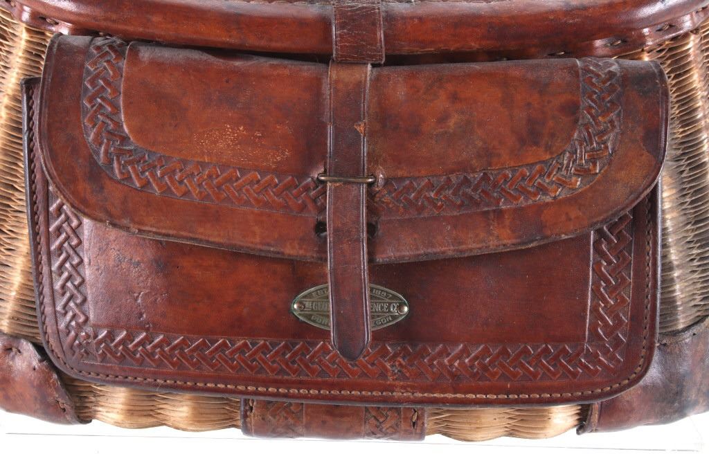 Featured in this lot is a rare, George Lawrence Company Model 4 AP fishing creel from the 1940-50s, made in Portland, Oregon. From 1923 to 1954, the Lawrence Company was a leading manufacturer of Oregon creels in Portland. The George Lawrence Company, founded in 1857 in Portland, Oregon, was known for creating high-quality leather items, such as fishing creels. Their creels made between 1923 and 1954, are renowned for their superior craftsmanship and design. These creels have finely woven wicker baskets accented by saddle leather components. The leather is frequently tooled or embossed, revealing exquisite designs and exceptional craftsmanship. This creel features a split willow weave and leather construction and an open section in the top for throwing fish in and a handle on the back for easy carrying. The tooled leather shows geometric designs and features a metal and leather belt buckle on the front to secure the lid. Also featured on the front is a leather pouch for storing various items adorned with the metal badge reading, "Established 1857 / The George Lawrence Co. / Portland, Oregon". The top of the lid is stamped with the model reading, "4AP". A shoulder strap is housed in the creel and can be connected through the back through two small slots. The creel shows good condition overall with little wear present and no signs of damage noted. It measures 7" L x 15 1/8" W x 9 3/8" H and weighs 2 pounds and 12 ounces. This exact creel previously sold for over $1,700 at auction.*