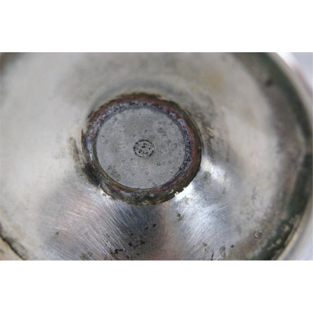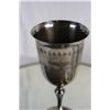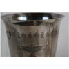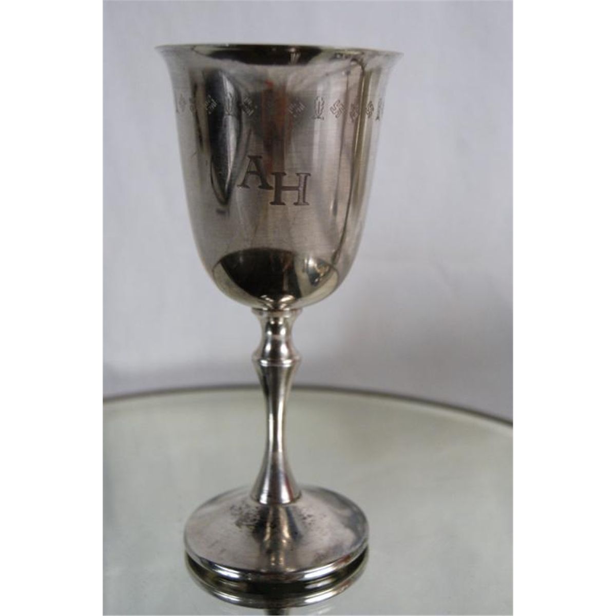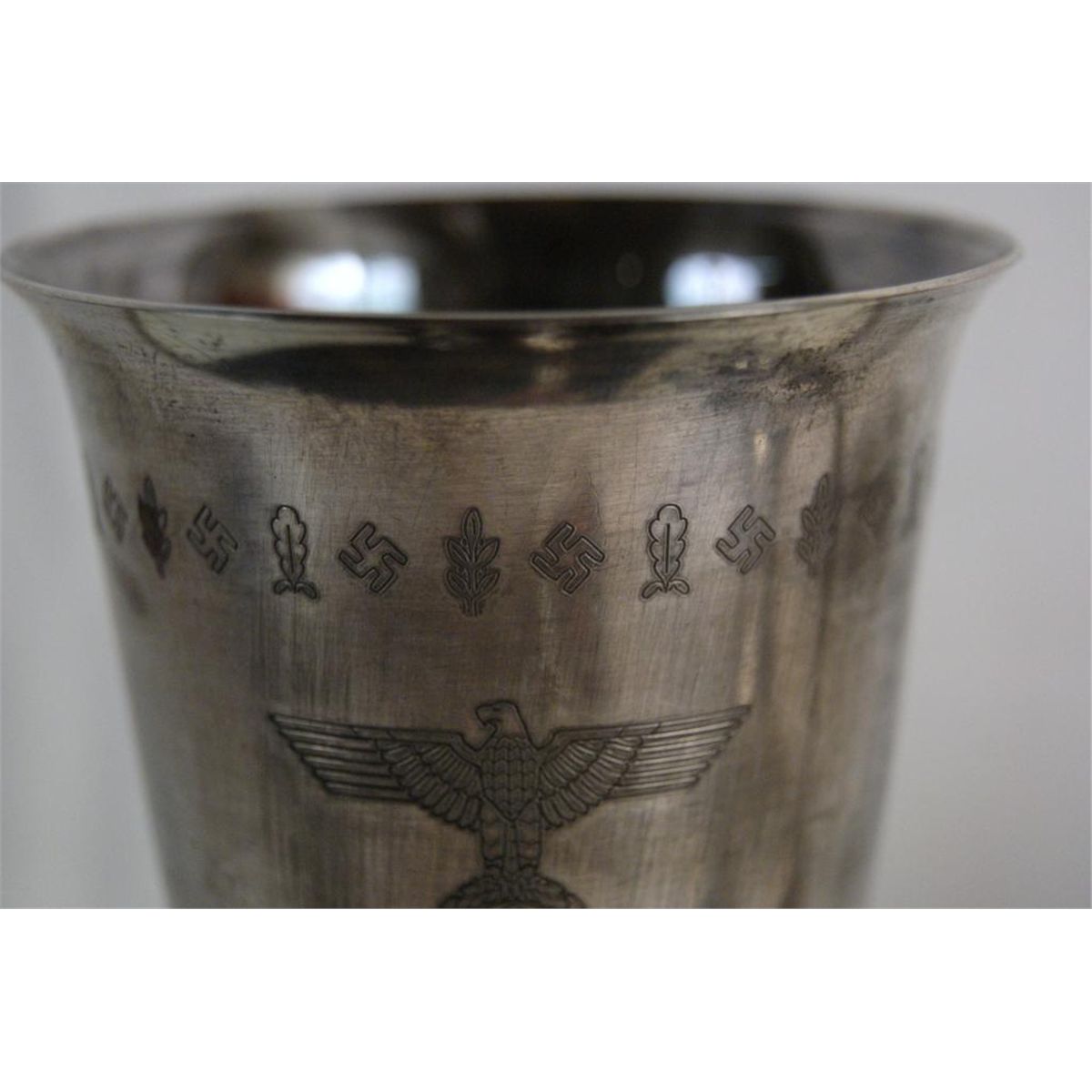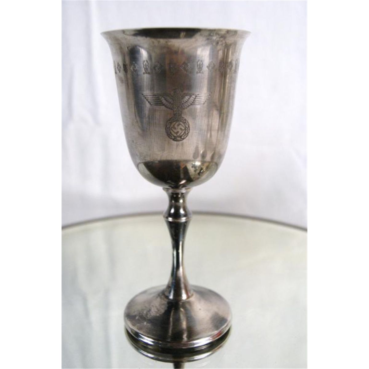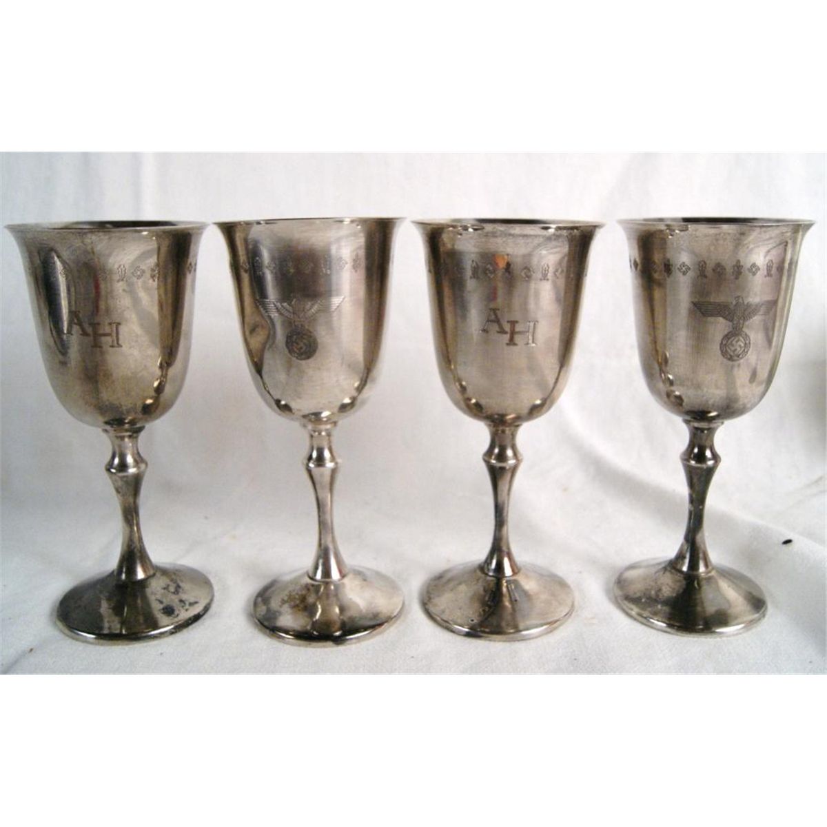 Four Adolf Hitler engraved (AH) Wine Goblets with Eagle/Swastika engraved on opposite side. Rim exibits an unusual swastika, oak leaf pattern. Marked RZM (Reichszeugmeisterei) on bottom