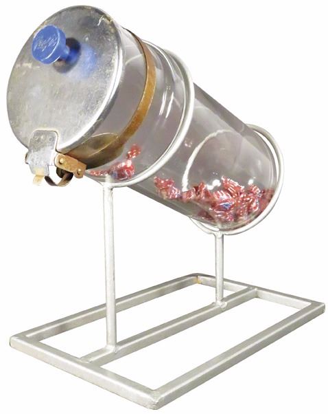 Glass Candy Store Display Jar with metal stand. Excellent Condition. 12 X 13 X 7 5/8 inches.