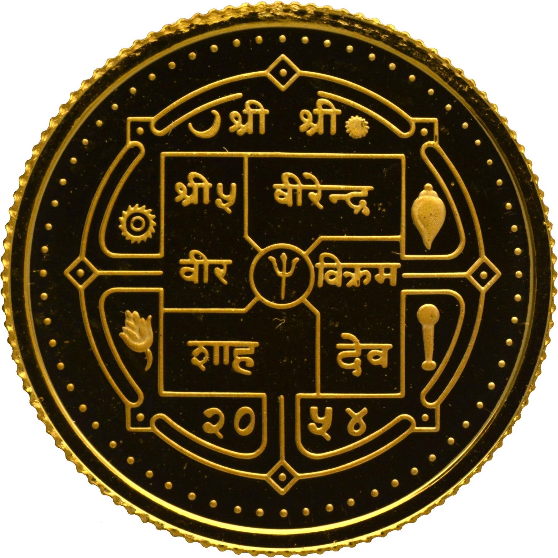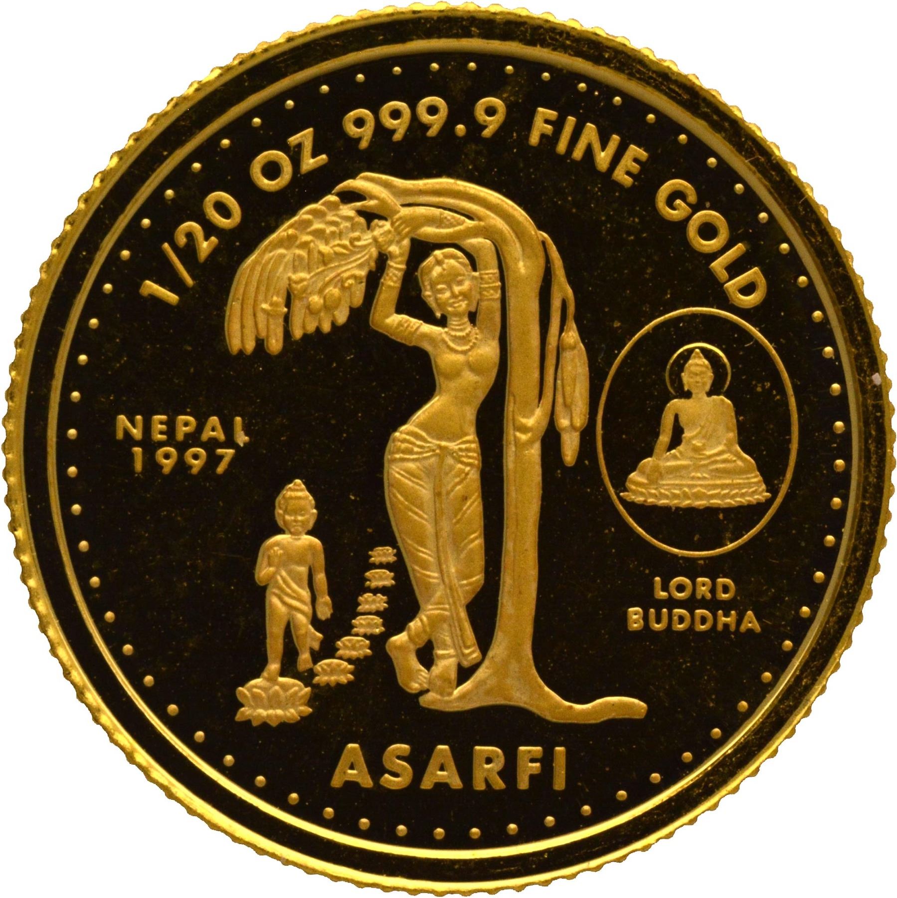 Nepal, 1997, Birendra Bir Bikram (1971-2001), Gold Proof ½0 Asarfi/Ashrafi, 1997, Obv: a woman holding a branch of a tree (Buddha’s Mother holding Shal tree) or Shaalbhanjika in the center, baby Buddha walking seven with seven blossomed lotuses on his trail and seated Buddha in meditation on the right field, gold purity details above, country name, date and denomination in the fields, Rev: kings name and date within Nepalese traditional design, 1.57g, 13.90mm, proof, Rare.