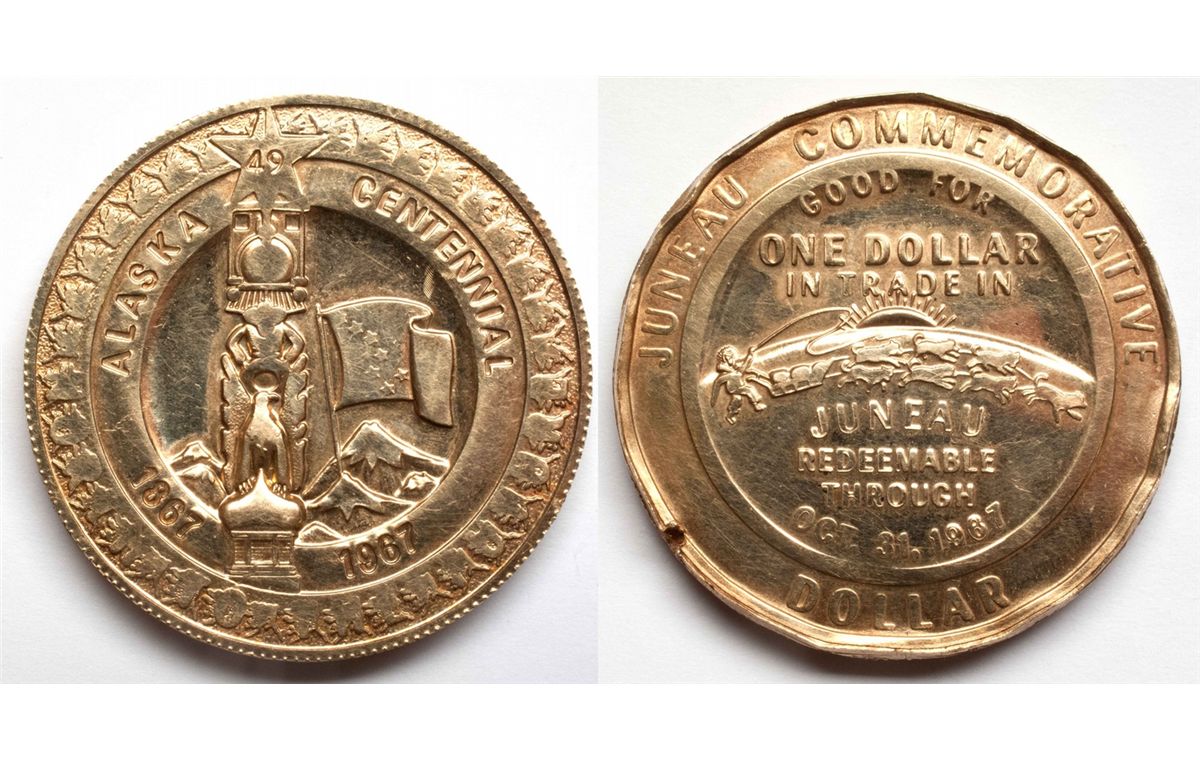 The weight is 2.345 troy ounces and the specific gravity is 15.14. This indicates a fineness of .750 or 18 karat. The specimen is a bit beat up around the edge of the obverse and has a line running between the ‘A’ and ‘T’ in ‘commemorative.’ Still it is a wonderful 18kt gold prototype specimen from our 49th state. You will not find a better valued or historical token from this era. There is no public sales record for this piece. The front features an Iditarod dog team and states 'Juneau Commemorative Dollar.One Dollar In Trade In Juneau Redeemable Through Oct.31,1967'.The back features a flag,mountains and a totem pole and states 'North To The Future.Alaska Centennial 1867 1967'City: JuneauCounty: JuneauState: AKDate: 1967