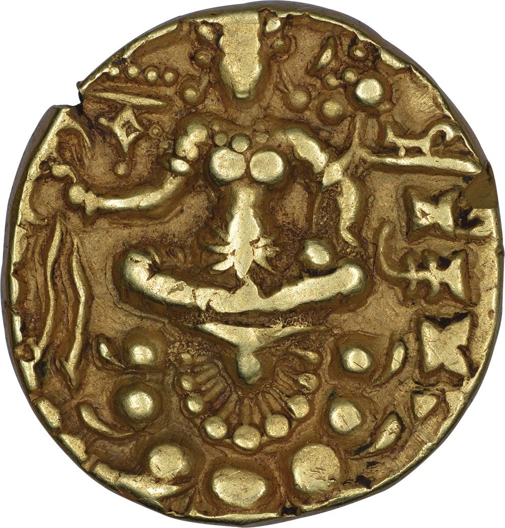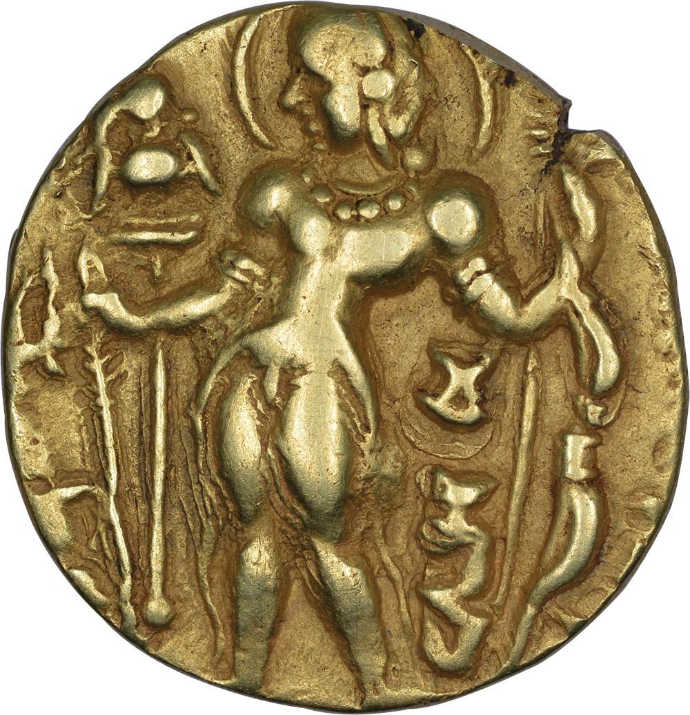 Gupta Dynasty, Chandragupta II (380-413 AD), Gold Dinar, Archer Type, Obv: king standing left, holding an arrow in his right hand and holding indian long bow at top in left hand, sword at his hip, ’Chandra’ in brahmi below right arm, garudadhvaja to left, brahmi legend around ’Devashri Maharajadhiraja Sri Chandraguptah’, Rev: goddess lakshmi seated facing on a stylized lotus in padmasana, holding lotus blossom and diadem, tamgha to left, brahmi legend at right ’Sri Vikramah’, 7.95g, 19.36mm,(Altekar, Bayana # Plate VIII-14), about extremely fine+, Scarce.Reverse is exceptional as it shows heavy and complete details of the jewelry worn by goddess, superb bold strike.