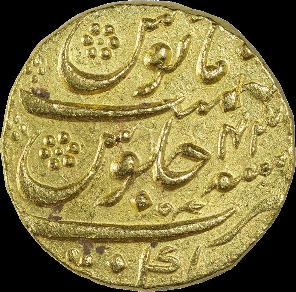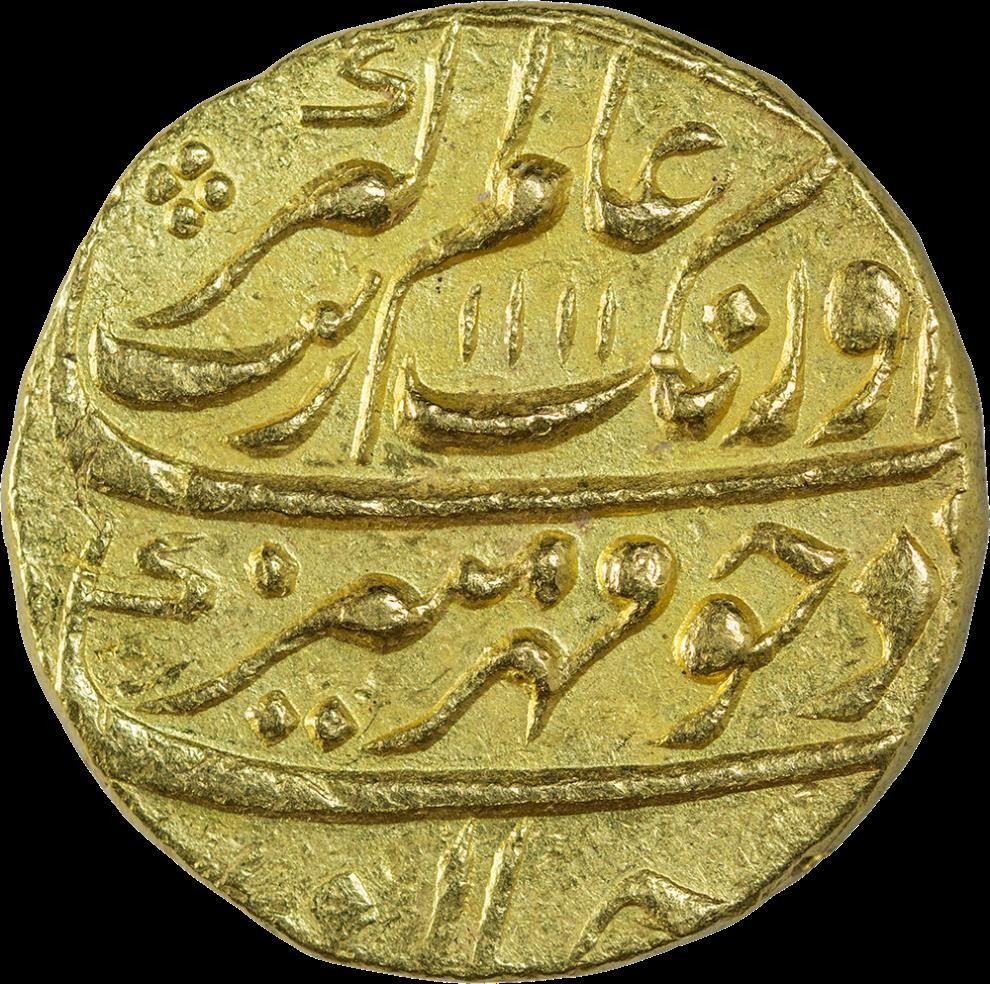 Auranngzeb Alamgir, GulbargaMint,Gold Mohur, AH 1111/43RY,Obv:mihr munircouplet,sikka zad-dar jahan chu mehre munir, shah aurangzeb alamgir, sana hijri,Rev:sana julus zarb gulbarga,10.90g, 21.43mm,(KM # 315.19),about extremely fine,Rare.