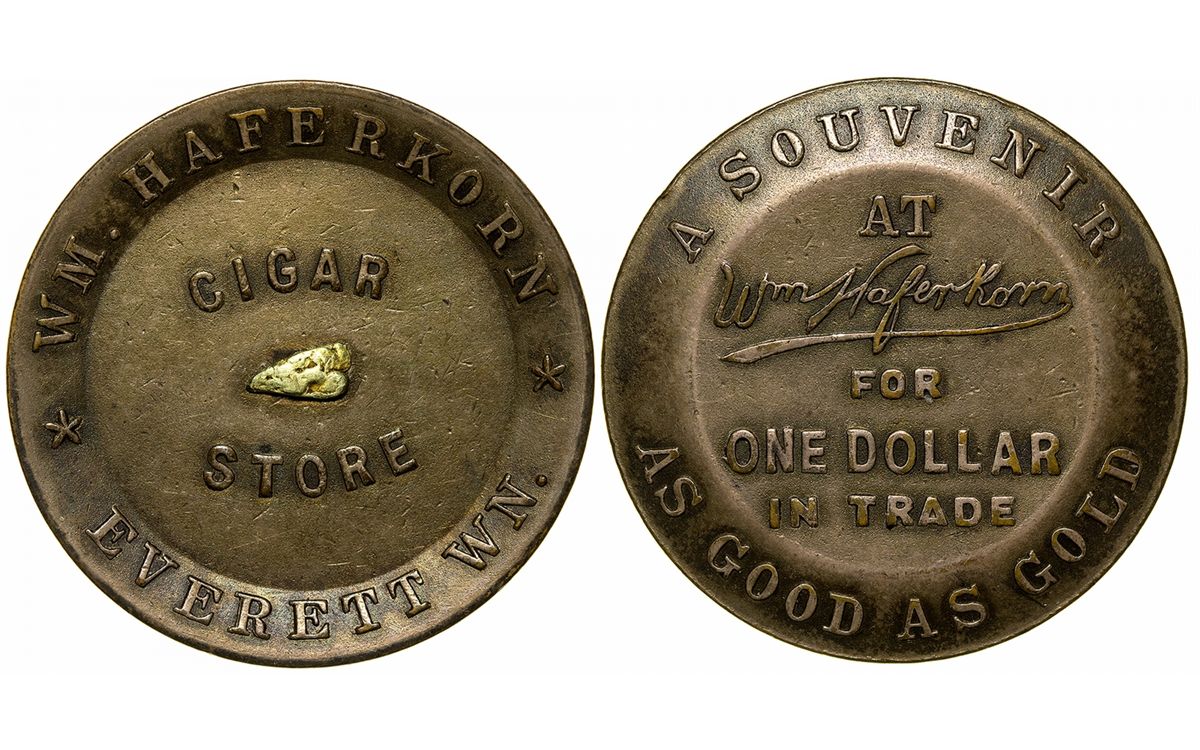 c1900 A rare gold nugget souvenir token from the Wm. Haferkorn cigar store in Everett, Washington. This token was likely made to promote Hafferkorn's cigar store at the AYPE (Alaska Yukon Pacific Exposition) in 1909. Made in the shape of a gold pan with a gold nugget at center, it was good for $1. We have sold two of these rare tokens over the past three decades. This specimen is from the John J. Ford Collection, lot 22962, Ford XXIII, formerly of the F.C.C. Boyd estate. It is certainly one of the finest known. Everett is a terminus city, located 25 miles north of Seattle, at the mouth of the Snohomish River on Possession Sound. It is where steamships were made for the Alaska/Yukon gold rush, and where many ships left for the goldfields. Hafferkorn's cigar store was located on the busiest corner, Colby & Hewitt. On labor day in 1911, Haferkorn issued a paper token "to every man in the Labor Day Parade will receive a card ... (for)... one 12 1/2 cent El Soudan cigar", according to the Everett Labor Journal. - HKA#65734