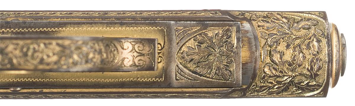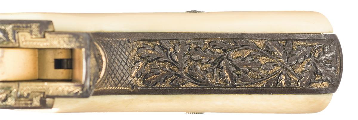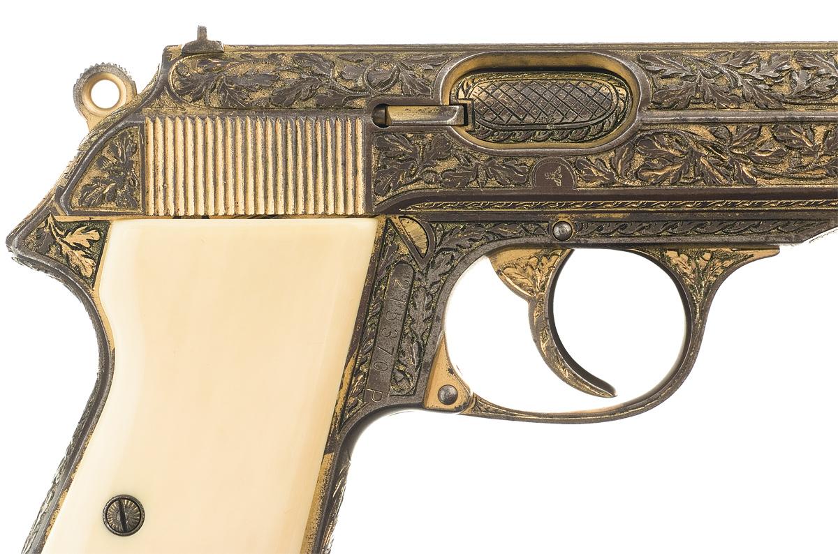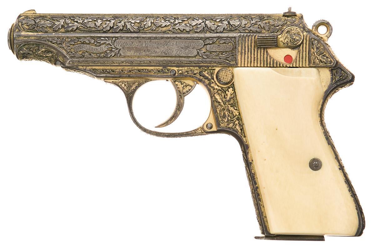 This World War II era Walther Model PP pistol with deluxe factory oak leaf and acorn engraving gold-plated finish and two-piece, ivory grips. The pistol is fully covered with relief engraving. The engraving extends to barrel chamber, the sides of the trigger, bottom of the back strap, the magazine floor plate and the safety lever. The grip screws are fully engraved. The left side of the slide has a relief banner stamped "WALTHER" followed by the two-line legend: ""Waffenfabrik Walther. Zella-Mehlis (Thur) / Walther's Patent Cal. 7.65 m/m" and the model designation "Mod PP" raised panels. The pre-war "Eagle/N" commercial proofmark is stamped on a raised panel on the right side of the slide, the barrel chamber and the right side of the barrel muzzle. The serial number, "215370 P" is pantagraphed on a vertical panel on the right side of the frame. The pistol has a stippled sight rib, cartridge indicator pin, 90 degree safety lever and magazine release on the side of the frame. The magazine has a gold-plated finish and is marked with the Walther Banner above "PP 7,65 m/m" on the left side above the floor plate.