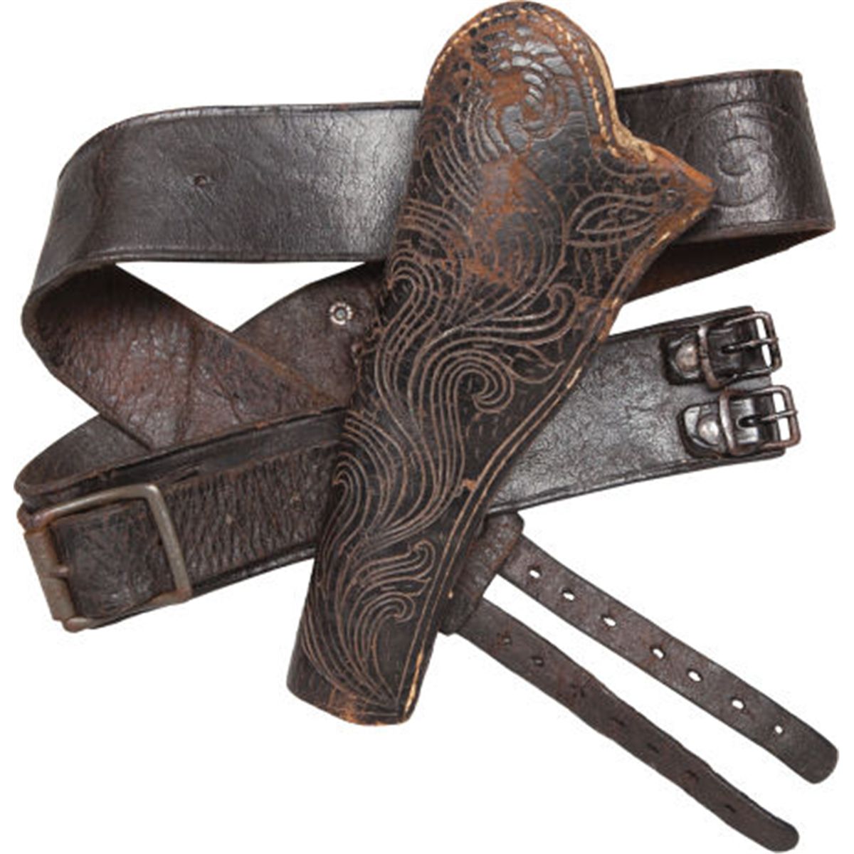 Rare Gold Rush Era Holster and Belt Ensemble for a Colt Baby Dragoon Revolver. The hand-tooled leather "slim jim" holster made specifically for the Colt Baby Dragoon revolver with a five-inch barrel. Single belt loop. Sold together with matching gun belt with double buckles and billets.Condition: Holster very good, showing wear and light checking. Interior with remnants of original chamois lining. Some period alterations to triggerguard area and minor seam repairs. Belt is good with overall wear and minor tear present. Rivets may be later replacements.