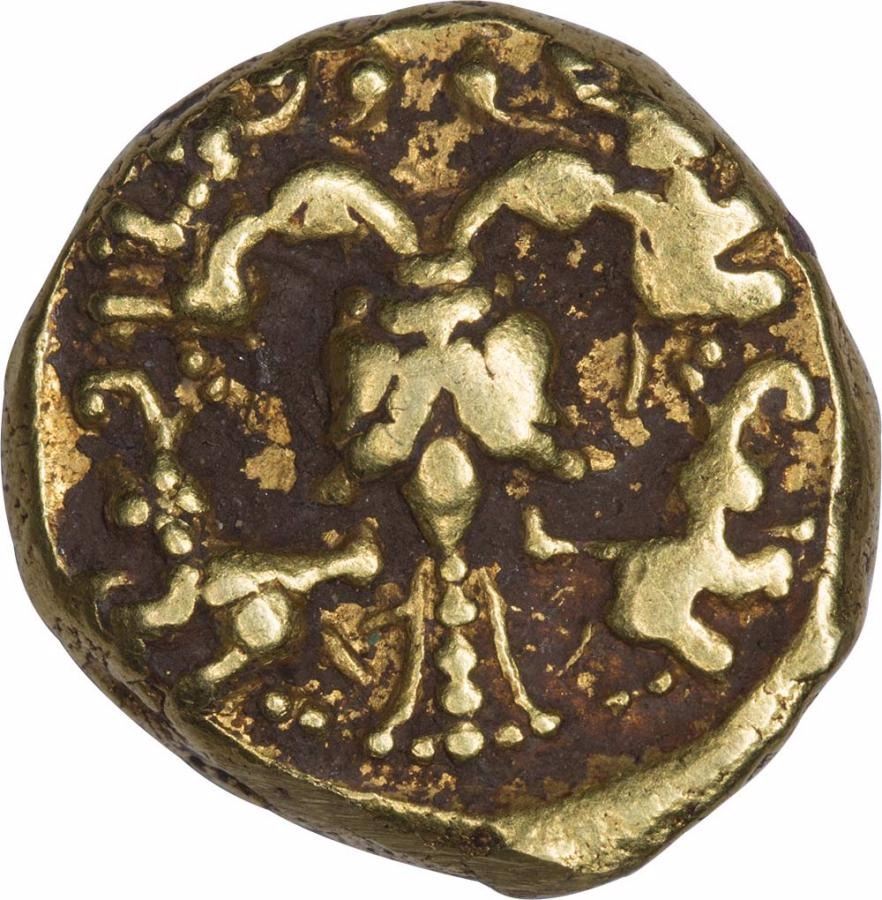 Vijayanagar Empire, Achutharaya, Gold Varaha, Obv:back view of gandaberunda or double headed eagle flying upward wearing ornaments, huge bird is flying and carrying elephant in its two clawa,Rev:three line nagari legend with interlinear rules,'sri pra/tapachyuta/raya',3.45g, 11.53mm,about very fine,Rare.