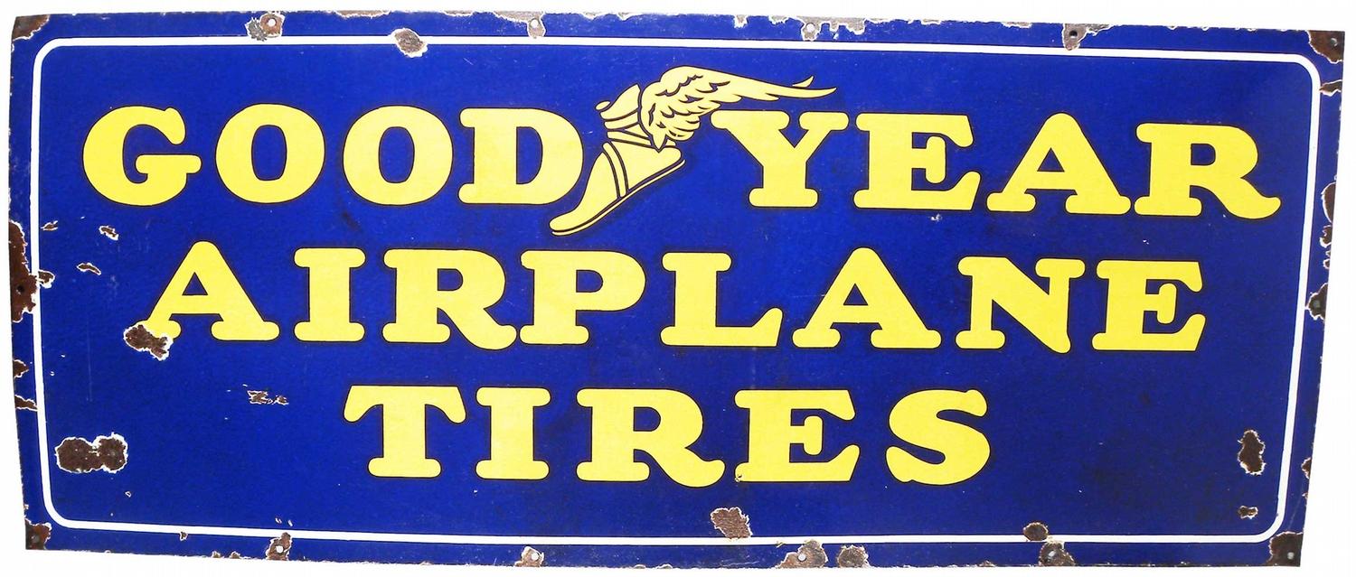 Extremely Rare Goodyear AIRPLANE Tires Porcelain Sign. Several chips around the edge and eight more inside white border otherwise good condition. 48 X 20 inches.