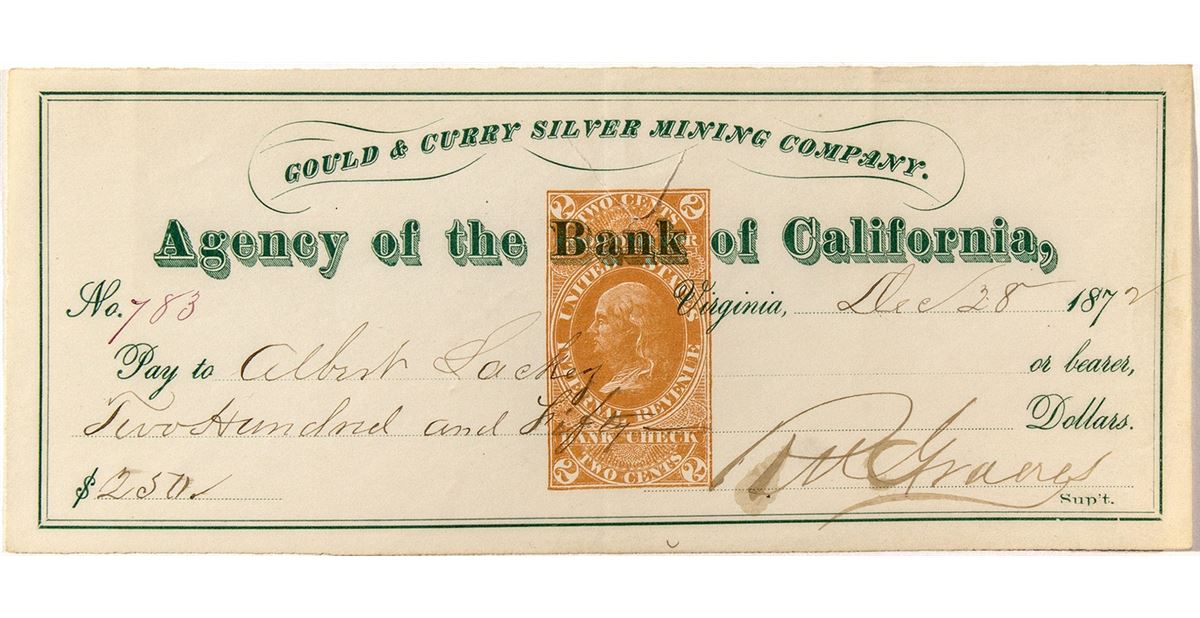 Dateline Virginia, Dec. 28, 1872. Pay to Albert Lackey $250. RN-B. Signed by R.N. Graves a superintendent. Robert N. Graves was once superintendent of the Empire Mill & Mining Co., as well as president of the Bodie Railroad, which he co-founded with Henry Yerington and Seth & Daniel Cook. Like other Comstock millionaires, Graves made his fortune on the Comstock and then retired in San Francisco. Cut cancel. (Prag Collection)