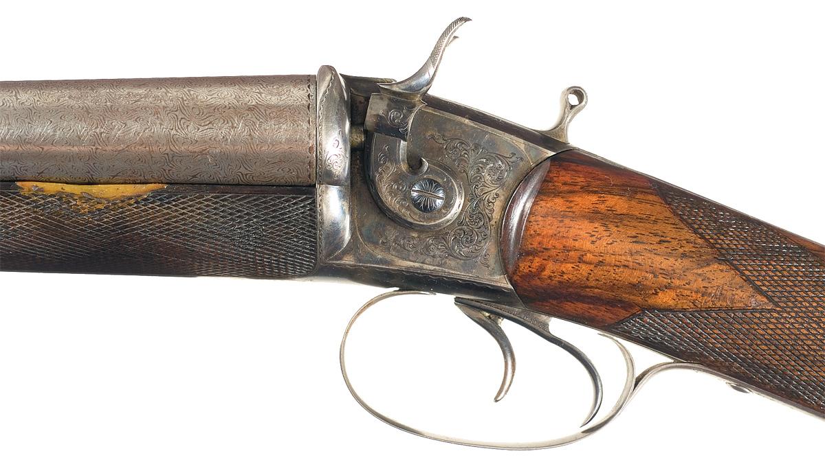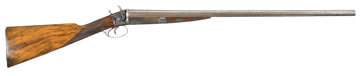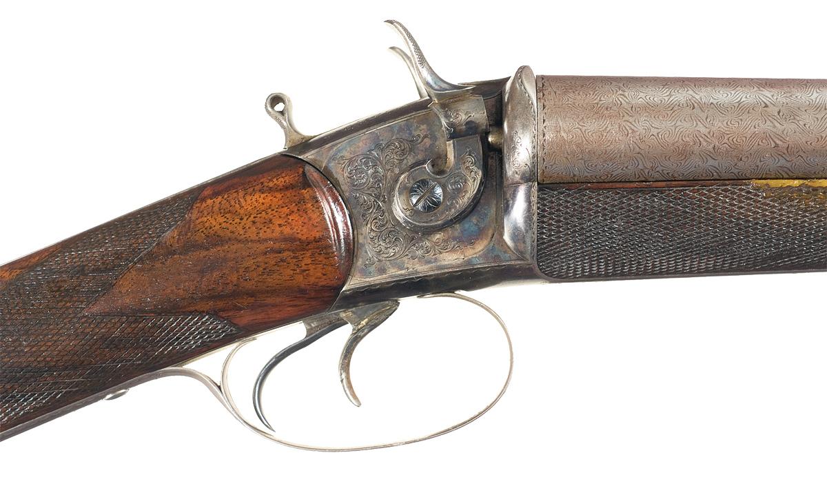 Only about two hundred guns were made by the company but they were all high quality guns, selling for several times what guns made by the competition were selling for. The marking engraved on top of the barrel rib was "WESSON FIRE ARMS Co SPRINGFIELD MASS." There are no other markings on the exterior. Indications of the high quality of engraving on these guns include the engraving. Executed by Gustave Young, whom many believe to be the finest engraver of all time. The gun was patented by Daniel B. Wesson on Dec. 17, 1867 and the patent was assigned to the Wesson Fire Arms Co. It is not known why the new company was necessary as it had the same principals as Smith & Wesson. The company only lasted for four years and only produced around 219 shotguns. One reason for the high cost was the exact fit required for the fit of the new action. The action was cut away on the sides so checkered wood pieces could be inserted, thus lessening the weight of the piece. The buttplate is another weight saving device. The metal center was cut away and only the "skeleton" inlaid around the edge of the butt. The end grain of the wood was then checkered. This system saved weigh, but was highly labor intensive and was part of the reason for the high cost. The engraving by the Master Engraver in America at the time, Gustave Young, would not have added that much to the cost as the cost of engraving on the gun was only a couple dollars. The action was somewhat different from those used by other makers. The rear of the lever was lifted, removing a wedge from the rib extension on the barrel. This was similar to the system used by Remington on their first model shotguns seven years later. Chambered 2 3/4", choked improved cylinder/improved cylinder with extractor. Damascus barrels with casehardened action, hammers, trigger guard and skeletonized buttplate. The shotgun is mounted with a checkered forearm and straight grip stock with checkered bare portion of the butt and a silver initial oval. Length of pull is 13 3/4".