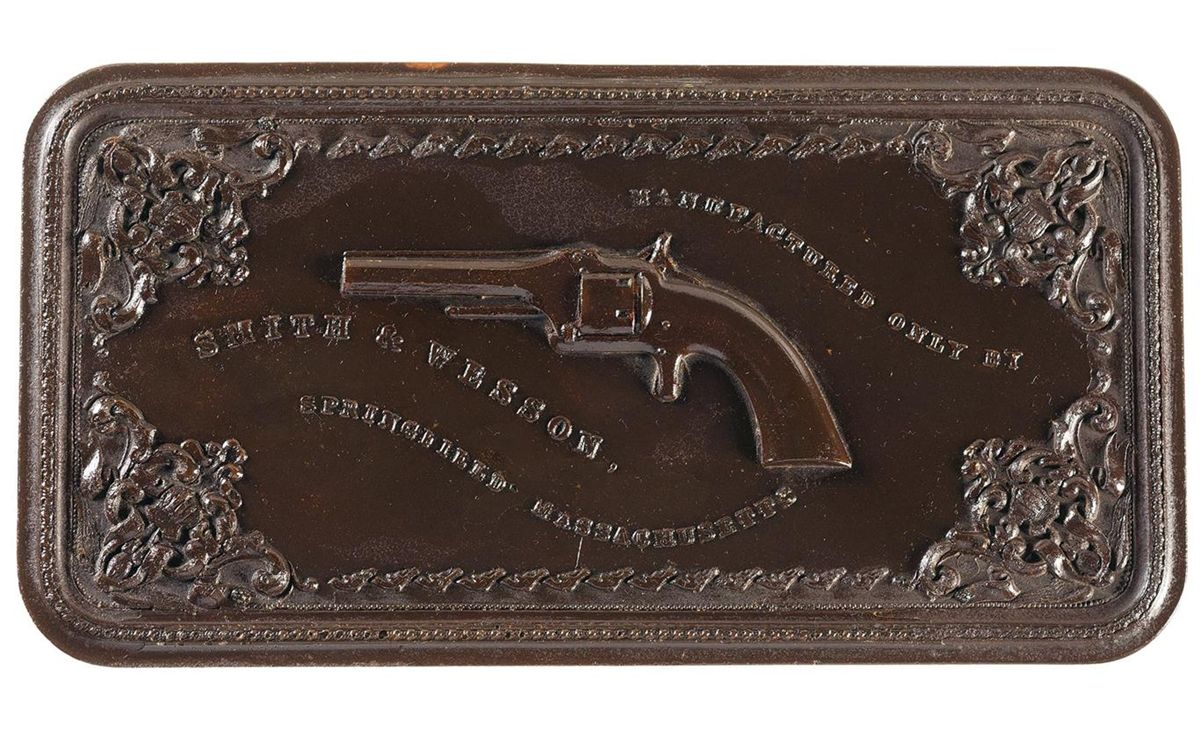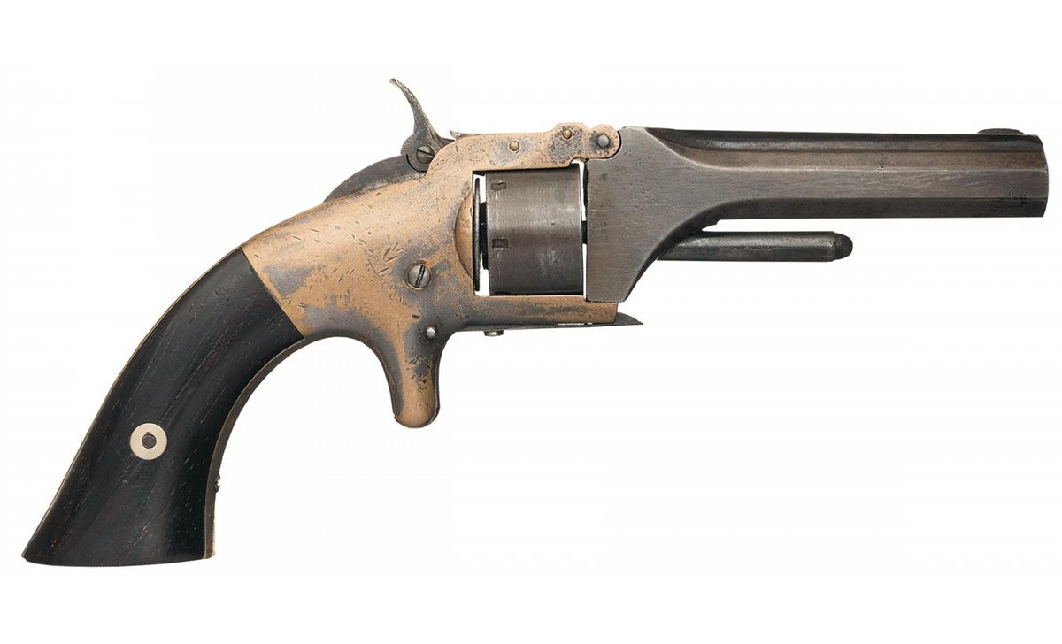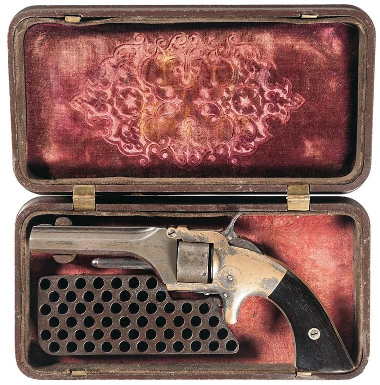 Patented April 3, 1855 this is an excellent example of Smith & Wesson's first mass produced revolver. Smith & Wesson manufactured 6 different variations of the First Model between 1857-1860. This is the rare 2nd variation, the last of the "bayonet latch" barrels with total production of the 2nd variation around 917. German silver blade front sight with standard one line "SMITH & WESSON SPRINGFIELD, MASS." address. Matching numbers on the frame, barrel, grips, and cylinder. Silver plated frame with blue barrel and cylinder. Finished with smooth rosewood grips. The original factory gutta percha case has the depiction of the revolver on the lid with a number of smaller revolvers, 4 shields and some scrollwork in each corner and the legend "MANUFACTURED ONLY BY/SMITH & WESSON/SPRINGFIELD, MASSACHUSETTS". The case is padded velvet with a floral design in the center inside the lid and red felt on the bottom, along with a 55 .22 caliber cartridge block.