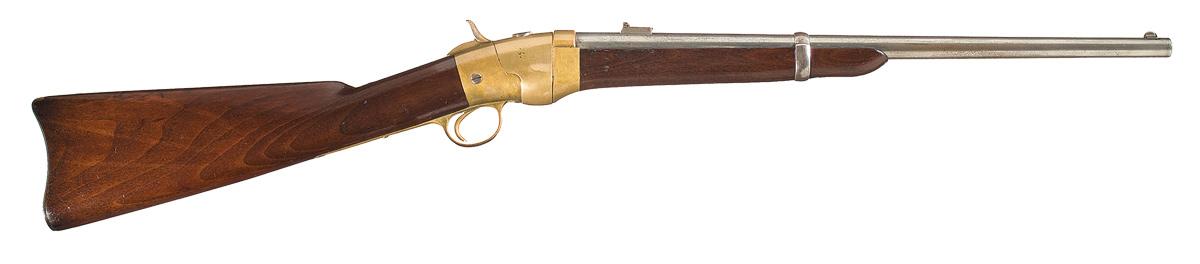 A truly unique, Hammond's patent breech loading carbine. One may recognize the action as Hammond also made a 44RF caliber pistol called the Bulldog. The carbine has a 20-inch round, smoothbore, bright-finished, barrel with folding rear sight. The carbine brass receiver, trigger guard and hammer. The brass breechblock has a oval checkered latch at the top which allows the breechblock to swivel to the left and exposes the chamber. A steel ejector is mounted on the left side of the breech. The stock and forearm are oil-finished black walnut with bright, steel barrel band, buttplate and band spring. The carbine has no visible markings.