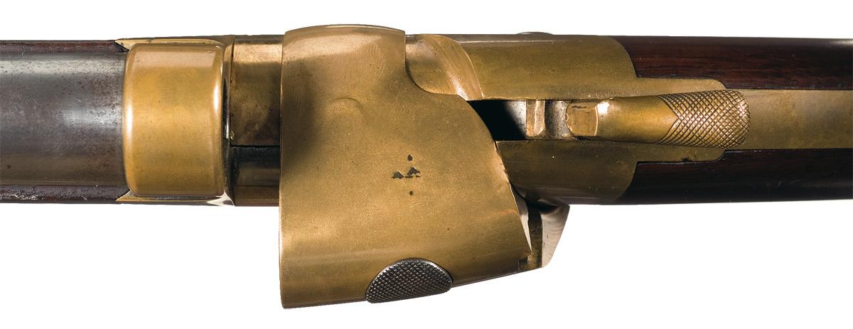 Condition: Very fine. The steel barrel, barrel band and buttplate have the original bright finish with an attractive patina. There is some light rust on the buttplate. The brass receiver, breechblock, hammer and trigger guard have a mellow mustard yellow patina. Mechanically functions but hammer spring is weak. The stock and forearm are also in very fine overall condition with light handling marks. This is a totally original example of an extremely rare Civil War era breech loading carbine.