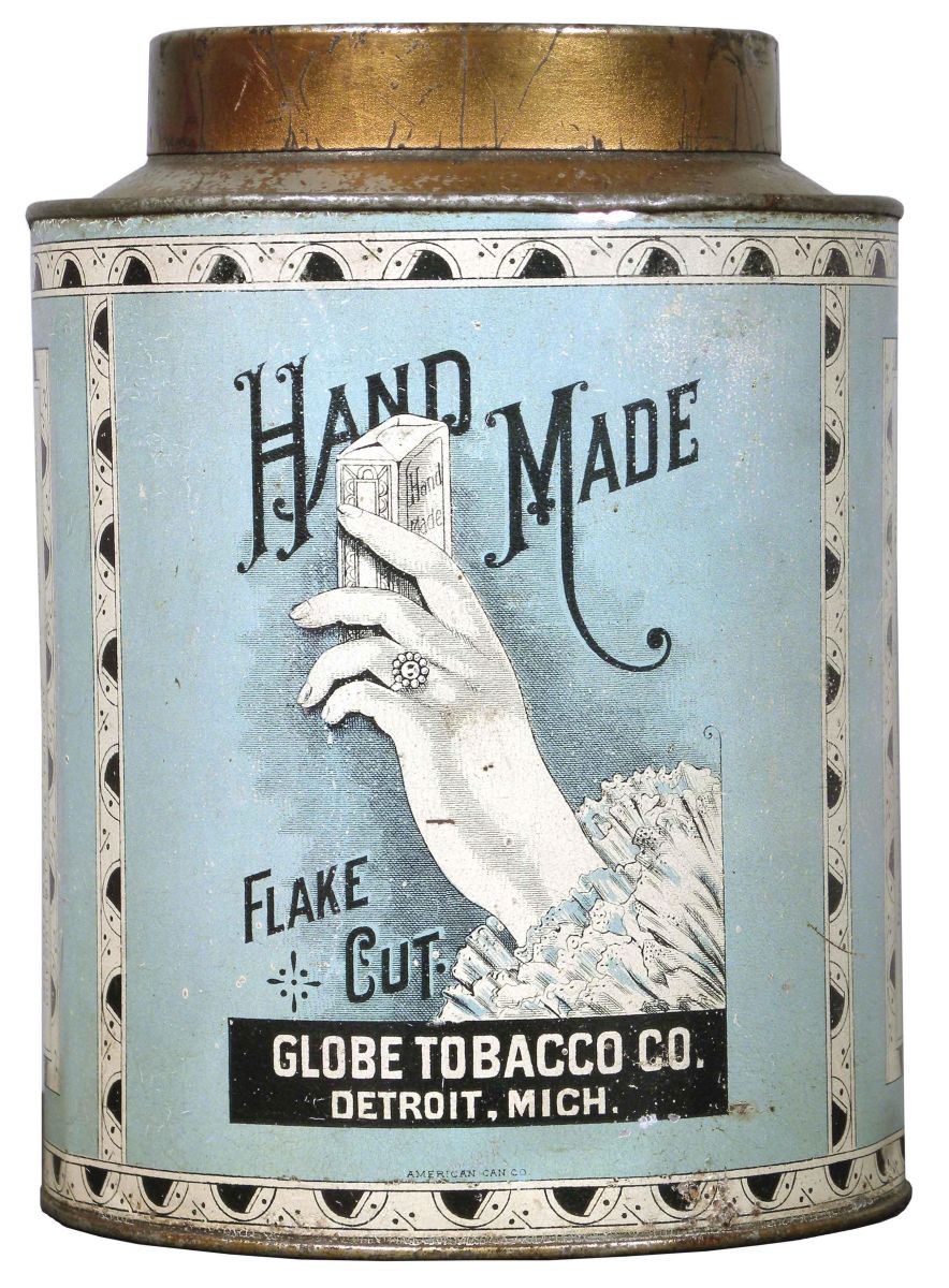 Rare Hand Made Flake Cut Tobacco Tin. Globe Tobacco Company Detroit, MI. A minor dent and some normal wear otherwise good condition. 6 1/2 inches tall. Start Price $30
