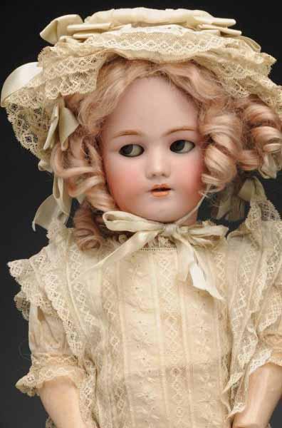 Description Germany, Ca. 1900. Bisque socket head incised "Heinrich Handwerck Simon & Halbig Germany". Flirty eyes (need some adjustment to the fragile eye mechanism), open mouth, original full blonde mohair wig. Original jointed composition body signed Handwerck (some soil). Fabulous original dress with lace and satin ribbon trim and silk bonnet with ribbons, no undies, shoes or socks. Condition (Excellent). Size 23" T.