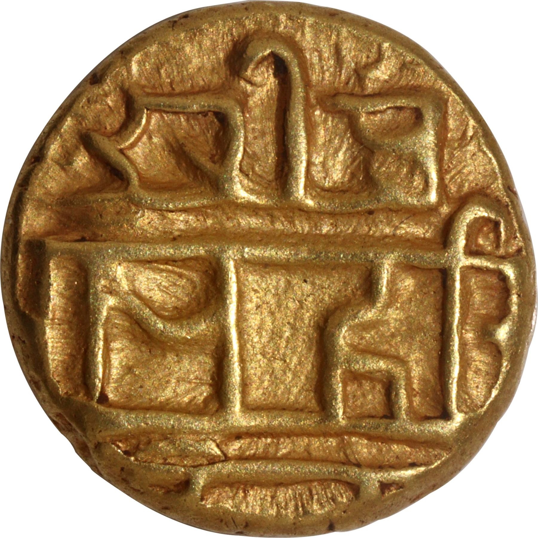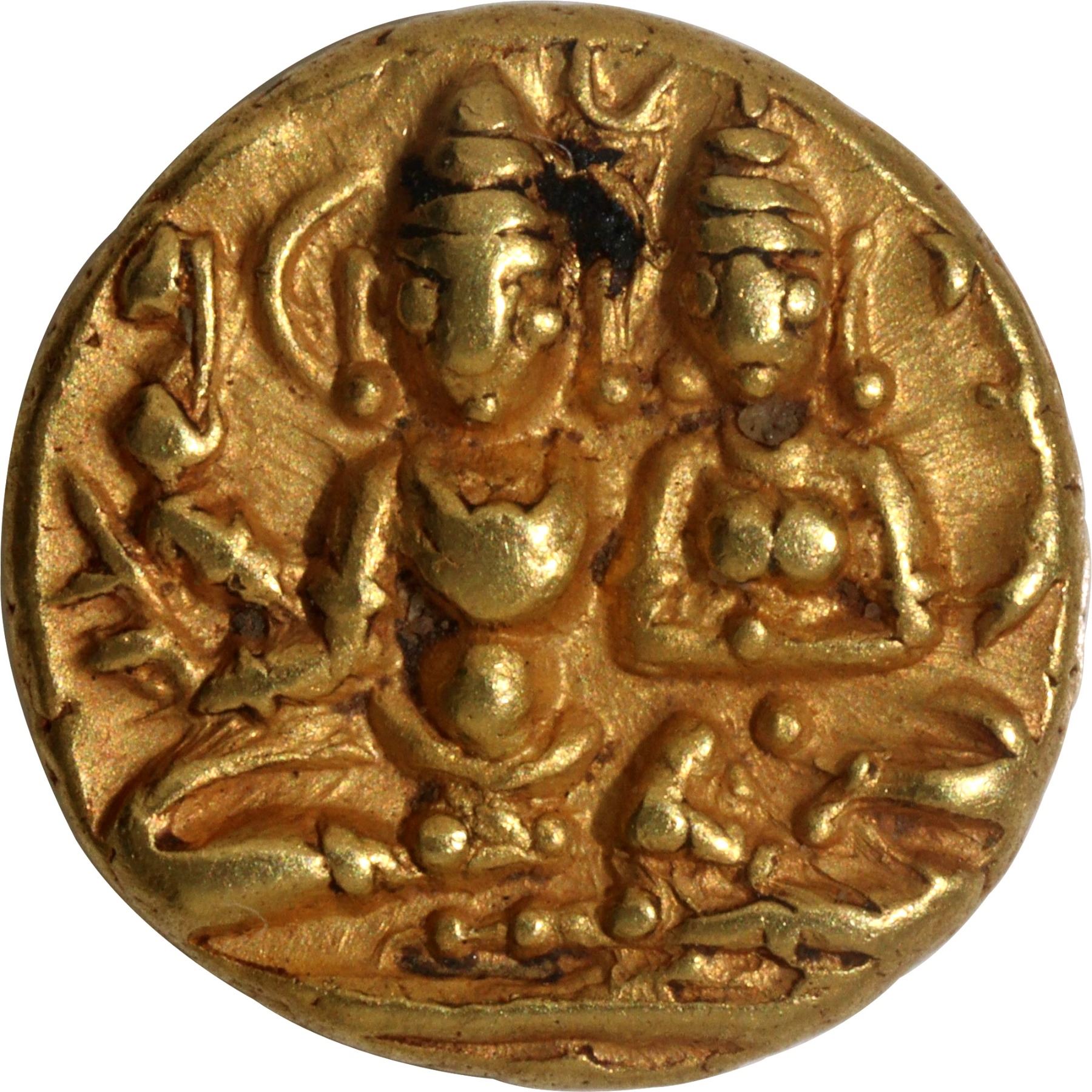 Vijayanagara Empire, Sangama Dynasty, Harihara II (1377-1404 CE), Gold ½ Varaha, Obv: the god Shiva seated in the padmasana posture with his consort Parvati resting on his left thigh, one of his left hands holds a trident and the other is around his consort's waist, one right-hand holds a battle axe while the other is in the abhayamudra gesture, the goddess has joined her hands in the anjalimudra gesture, the sun and moon near Shiva’s head, Rev: the Nagari legend "Sri Pra/tha pa Hari/(Hara)" in three lines with two interlinear rules, 1.6g, 9.74mm, (Mitch. K&A # 412/K Ganesh # 9.18), almost complete details visible, choice quality, about extremely fine, Rare.