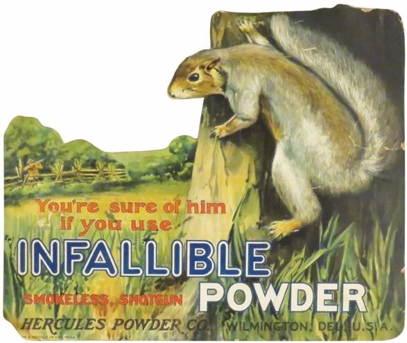 Rare Hercules Powder Die Cut Cardboard Easel Back Sign. Depicting squirrel on the look-out. Bottom left corner missing and two tears on right perimeter. 10 5/8 X 9 inches.