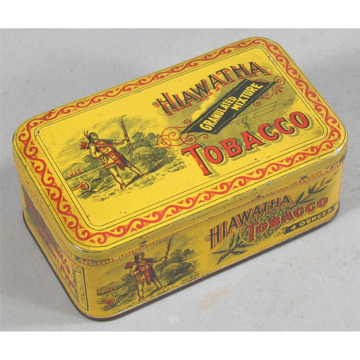 Rare Hiawatha Granulated Mixture Tobacco Tin. Slight dent top right corner otherwise very good condition. 5 X 2 X 2 1/2 inches. Start Price $40