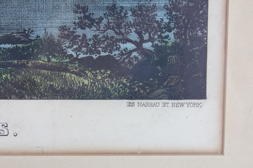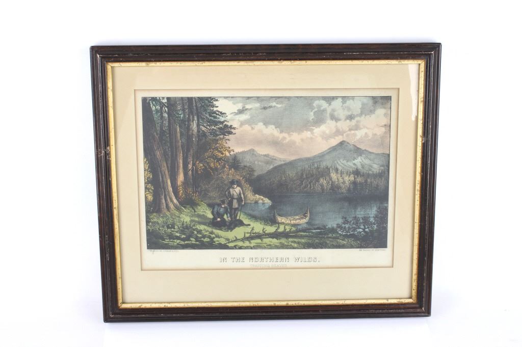 For your consideration is a rare, original lithograph of "In The Northern Wilds. Trapping Beaver." published by Currier & Ives; 125 Nassau St. New York. This piece is does not show a publishing date, but is believed to be published between 1865-1875. This hand-colored lithograph depicts a woodland, mountain scene with two hunters trapping a beaver at a lake’s edge, and a canoe in the water. It is beautifully framed in a dark wooden frame with a glass cover. This piece measures approximately 14x17 inches.