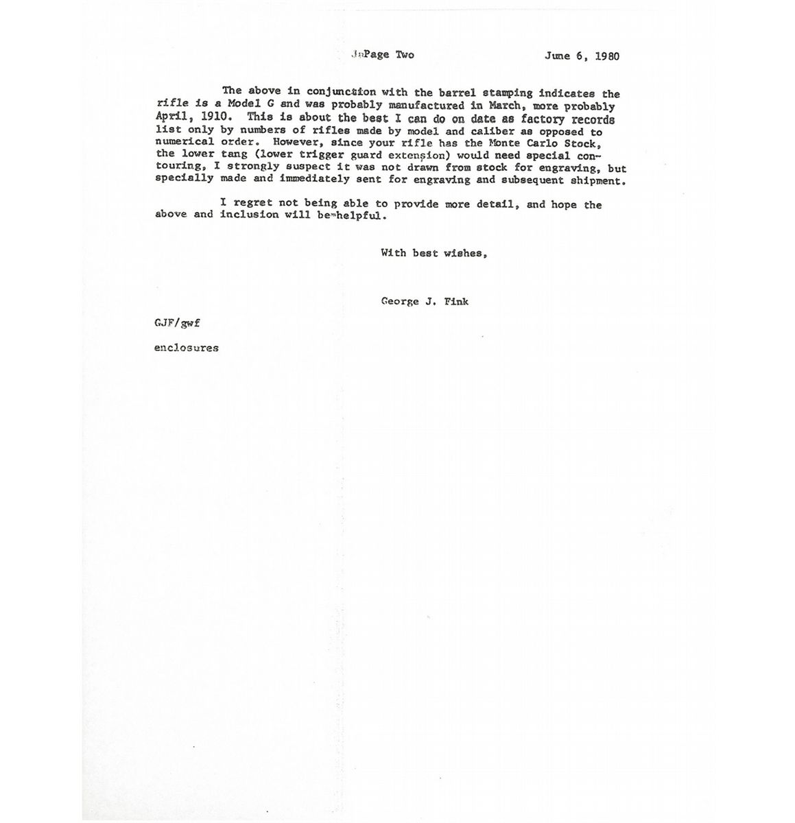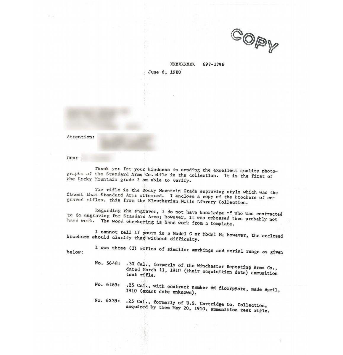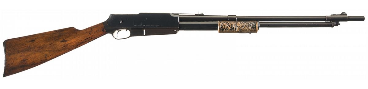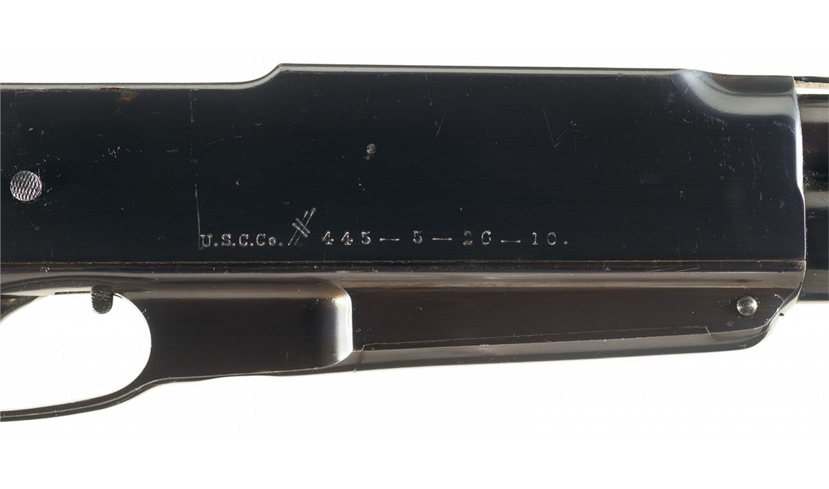The included inquiry letter from the Greenfield Village/Henry Ford Museum identifies this rifle by serial number as having been acquired by the U.S. Cartridge Company for factory cartridge testing on May 20, 1910. The right side of the rifle has the U.S. Cartridge Co. inscription and acquisition date "U.S.C.Co. # 445-5-20-10." Lyman blade front sight, elevation adjustable rear sight, two-line Standard Arms Co. barrel address, Japanned bronze alloy forearm and buttplate featuring high relief wildlife and logo designs and straight grip walnut stock.