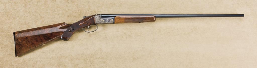 Rare Ithaca model 5E, .410ga, double barrel side by side shotgun, 28” barrels, factory single trigger, beavertail forend, cocking indicators, automatic ejectors, deluxe checkered burl walnut stock, gold inlays on each side of receiver, serial number “458452” made about 1931. The barrels are marked “Best Fluid Steel” beneath the forend, and show factory grade V markings. The gun remains in fine to excellent original condition showing 98-99% original blue, 90-95% original case hardening just toning slightly, fine to excellent fancily checkered burl walnut stocks with just some slight handling and a few marks. The interior is excellent. The stock measures approx. 14-3/4” to the end of the wood, with original buttplate. High grade prewar small bore shotguns are extremely scare and sought after by collectors and this is definitely one of the best in the 5E series. Estimated 1 of 7 made. Est.: $15,000-$30,000