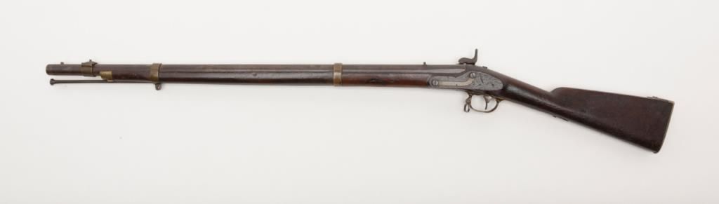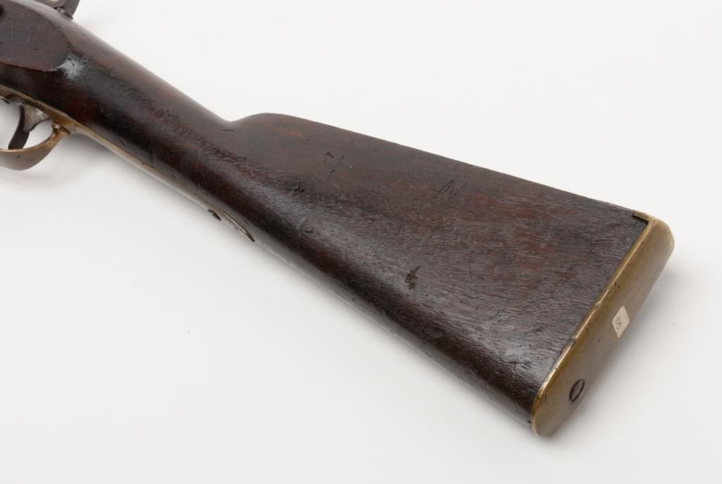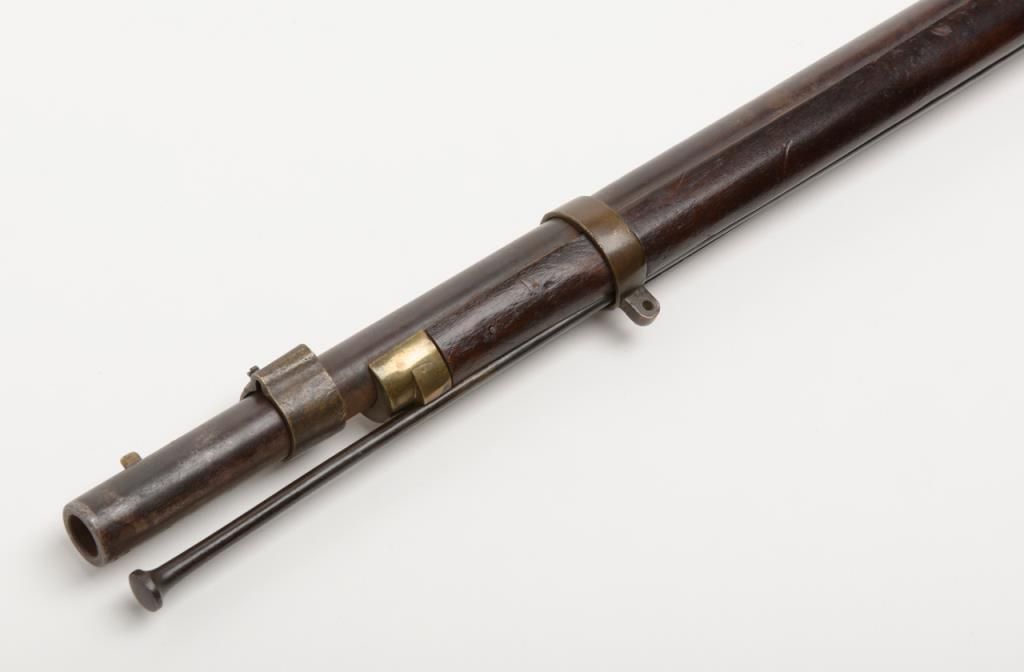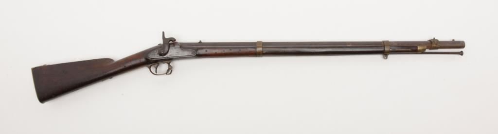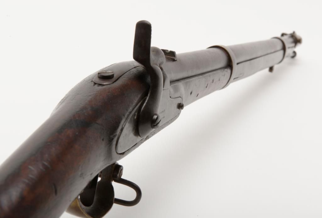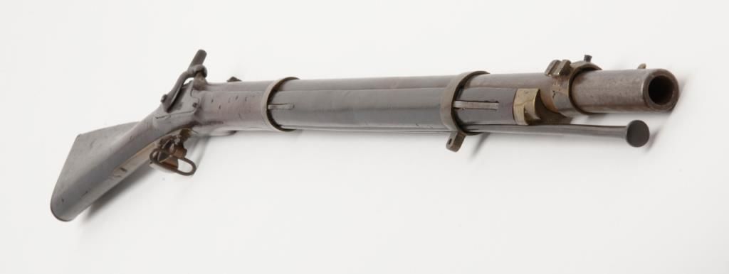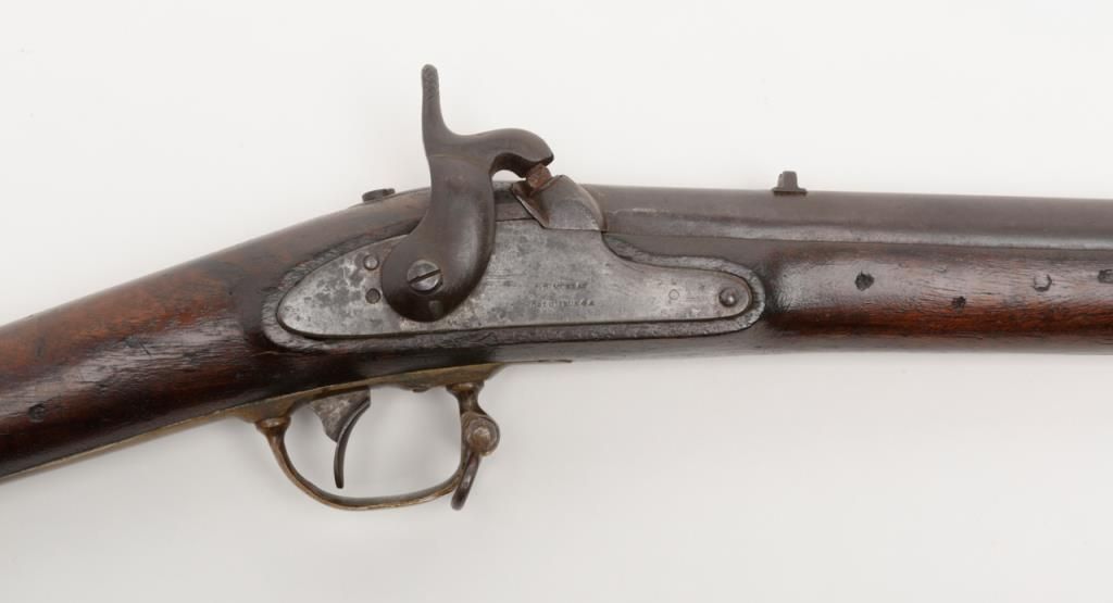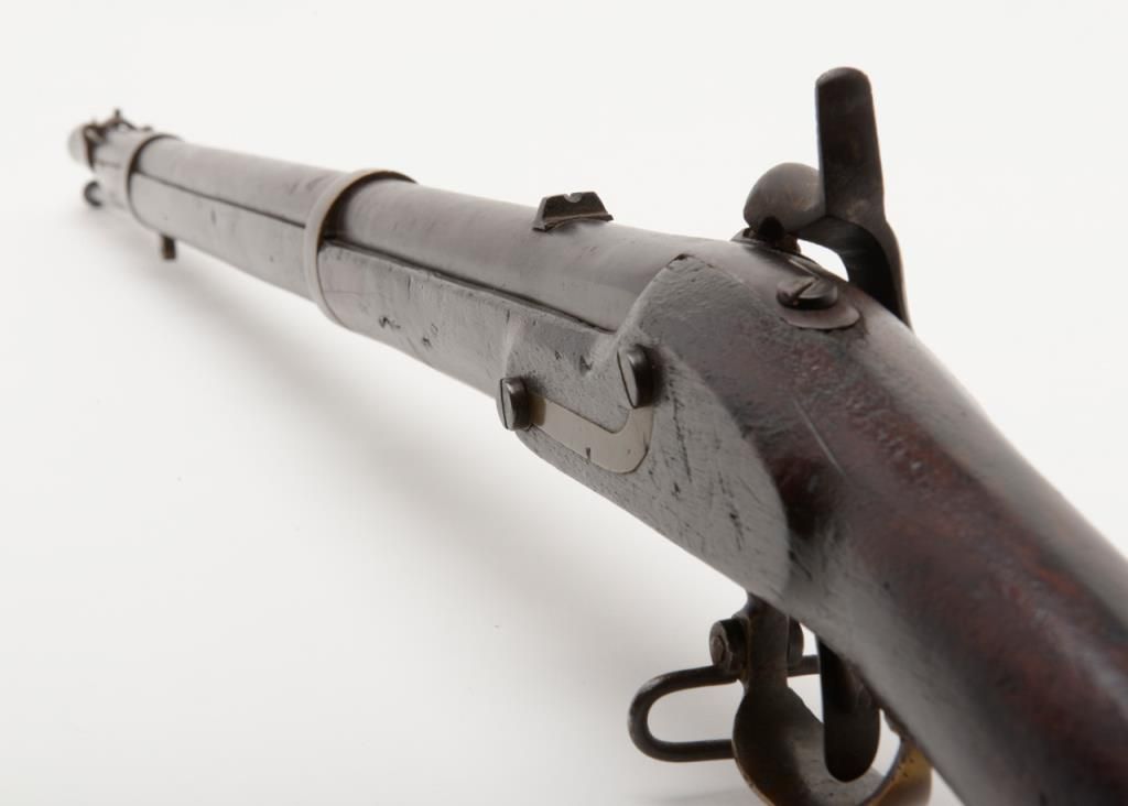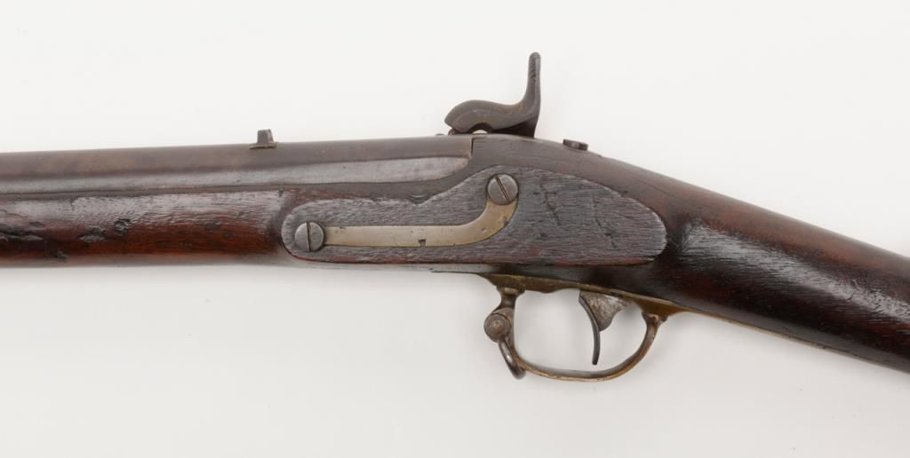Rare J.P. Murray Columbus, Georgia marked Confederate rifle in .58 caliber percussion patterned after U.S. model 1854 Mississippi style rifle in good to very good condition. 1 of only a few hundred estimated to have been produced andshowing a 33” barrel with wide brass adapting ring and stud for attaching saber bayonet (Refer Flayderman 10 – 049). There is a number 5 stamped inside the lock and 32/21 on the screws with I I I marked inside the side plate. The metal surfacesshow an even Brown patina with a light grayish silver patina on the lock showing some faint colors. The metal surfaces show some light scattered erosion and pinprick pitting. The forend has been professionally stretched from the rearbarrel band forward and this restoration is expertly accomplished. The rear and original portion of the stock is good plus with some dings, mars, scratches and small imperfections. Two solider ID initials N. are carved in the stock(one on each side). The brass shows a matching deep patina and 1 sling swivel is retained on the trigger guard and the front swivel is missing. An old ramrod is included. A exceptional Confederate arm in nice condition with a small amount of
