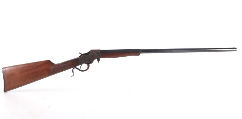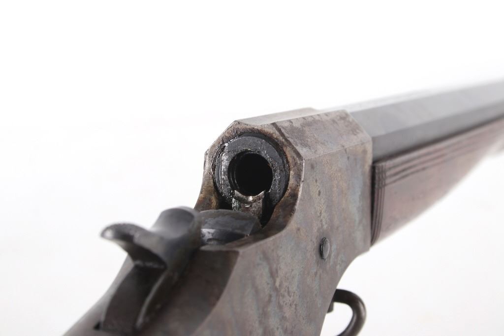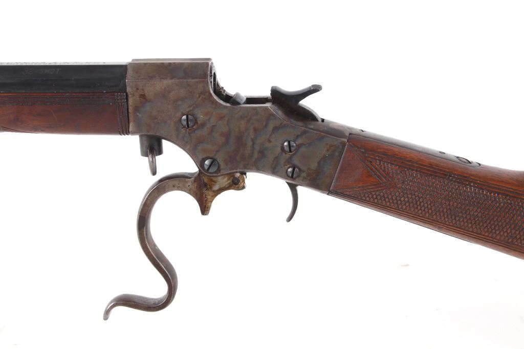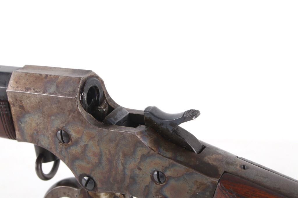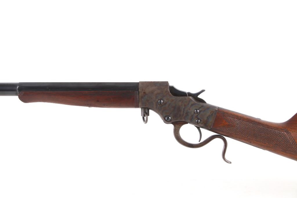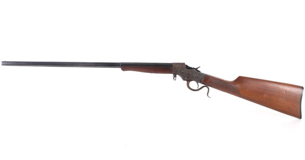 Exceedingly scarce and exceptional condition Stevens “Favorite” SHOTGUN. Almost the entire manufacturing run of the famous Stevens Favorite dropping block rifle was made in .22 Rim Fire or .25 Rim Fire calibers. This example, which may very well be a special order to Stevens, was made as a smooth bore and chambered for the .32 Rim Fire Shot cartridge! Generally these small gauge shotguns were intended as “garden guns” for eliminating vermin and pests or, in takedown versions like this, easily packed into the field, for scientists of the day intending to collect specimens for study or museum display. The light charges of extremely small shot (often #12 “dust” shot) did not damage the pelts of small birds and animals intended for the taxidermist. This example with serial number G 197 is in outstanding condition and retains nearly all of the vivid case colors on the receiver. Interestingly, the