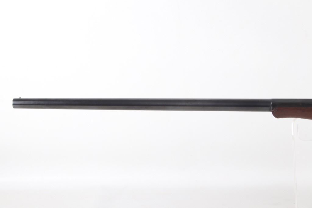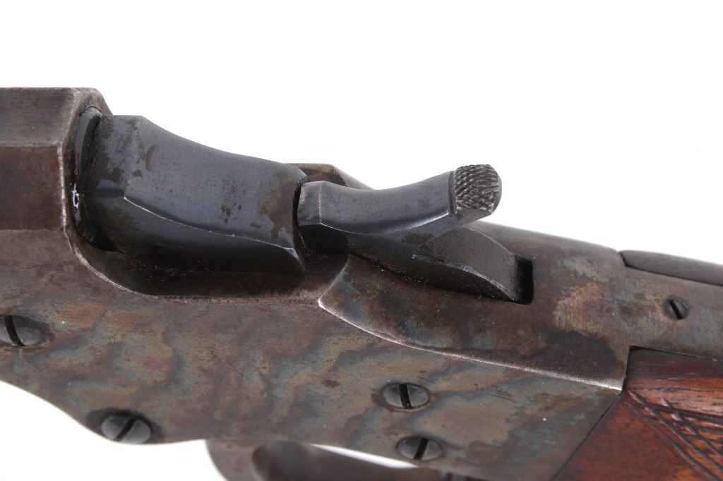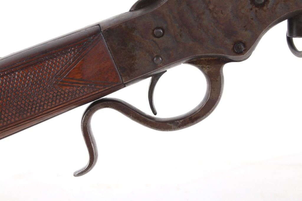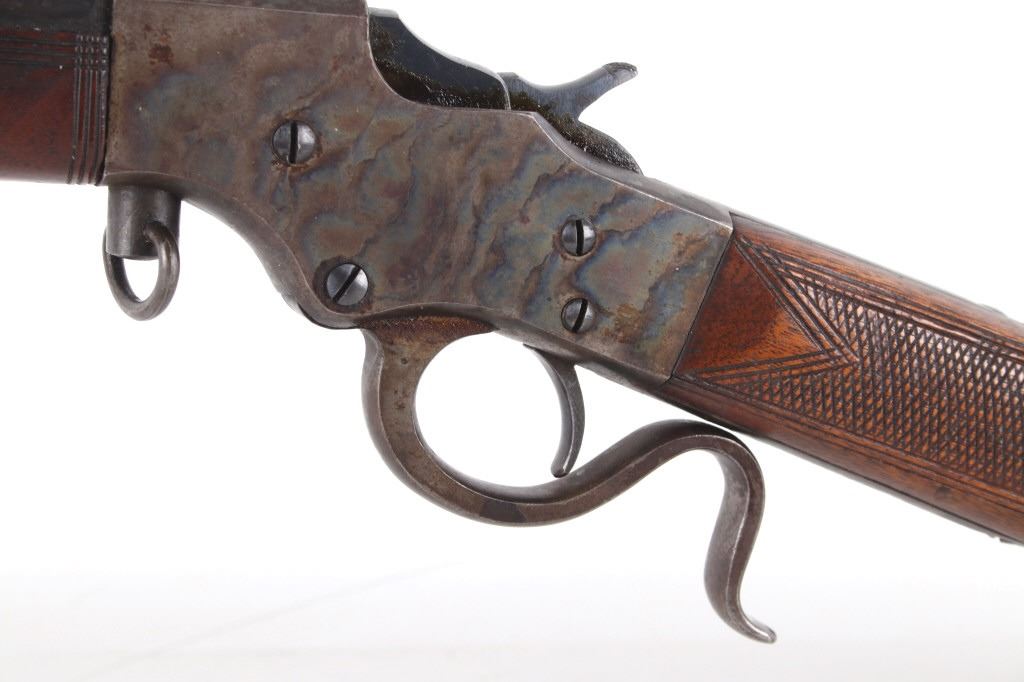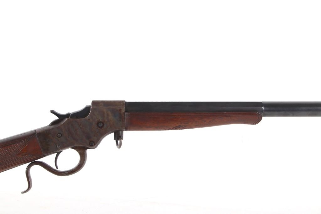 Exceedingly scarce and exceptional condition Stevens “Favorite” SHOTGUN. Almost the entire manufacturing run of the famous Stevens Favorite dropping block rifle was made in .22 Rim Fire or .25 Rim Fire calibers. This example, which may very well be a special order to Stevens, was made as a smooth bore and chambered for the .32 Rim Fire Shot cartridge! Generally these small gauge shotguns were intended as “garden guns” for eliminating vermin and pests or, in takedown versions like this, easily packed into the field, for scientists of the day intending to collect specimens for study or museum display. The light charges of extremely small shot (often #12 “dust” shot) did not damage the pelts of small birds and animals intended for the taxidermist. This example with serial number G 197 is in outstanding condition and retains nearly all of the vivid case colors on the receiver. Interestingly, the
