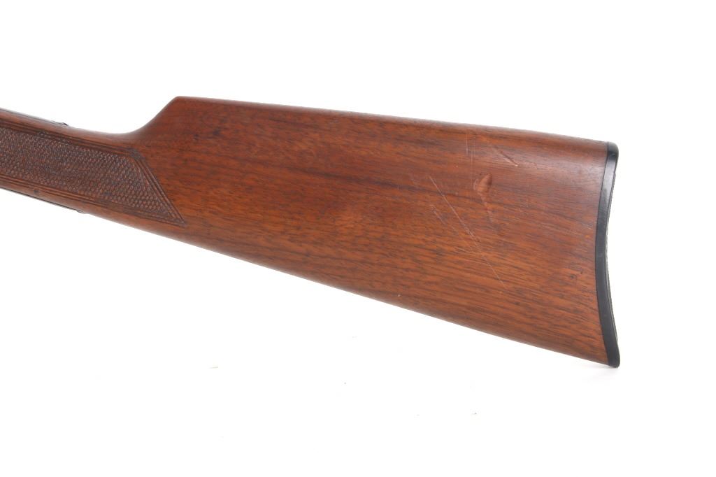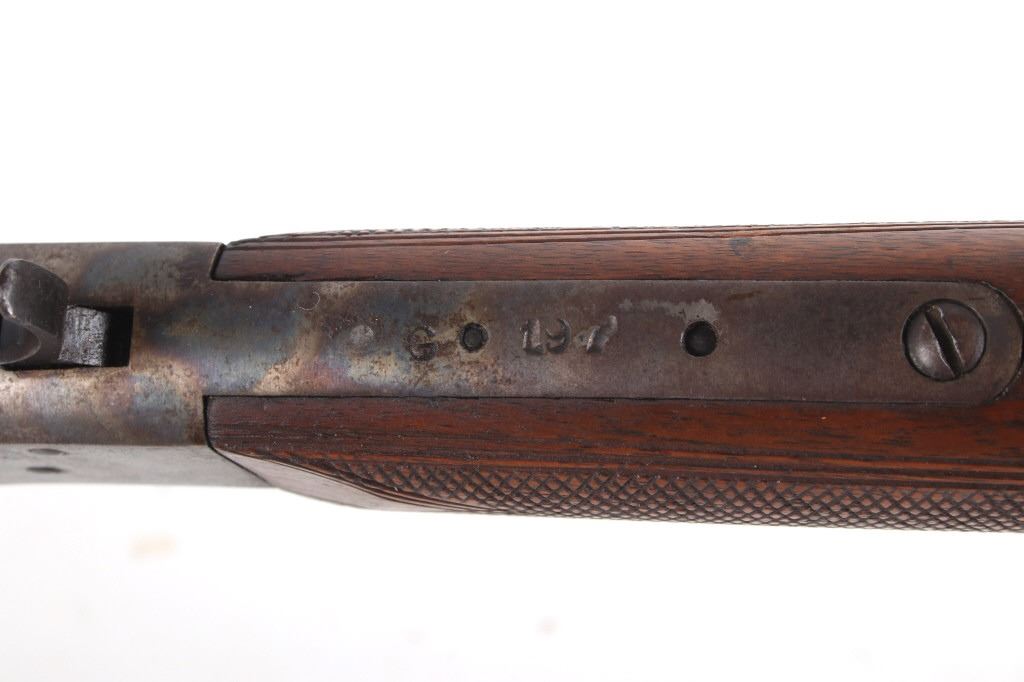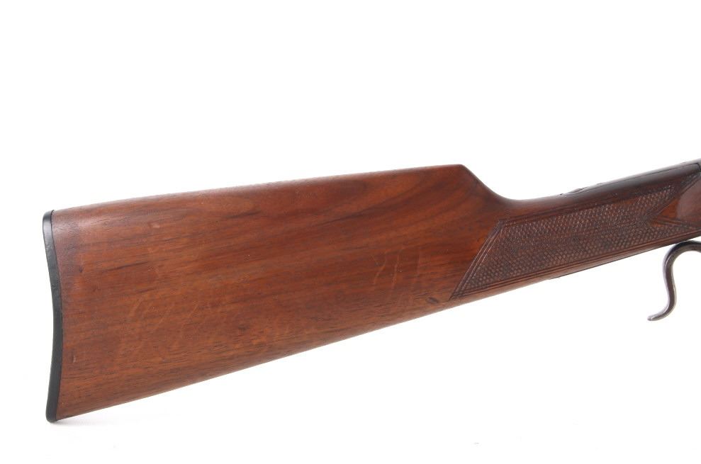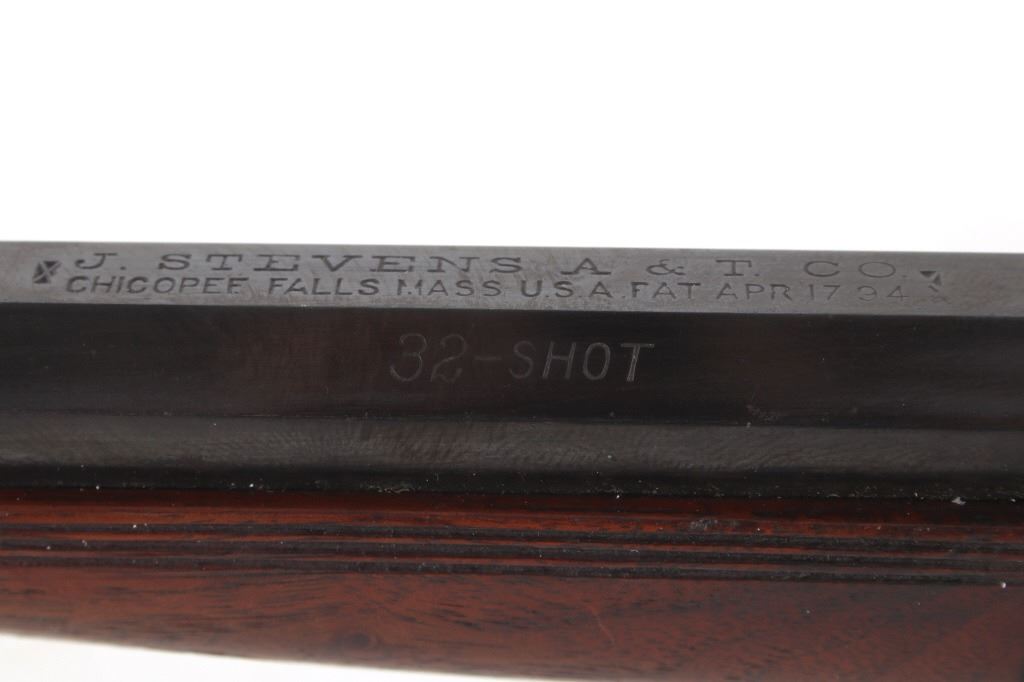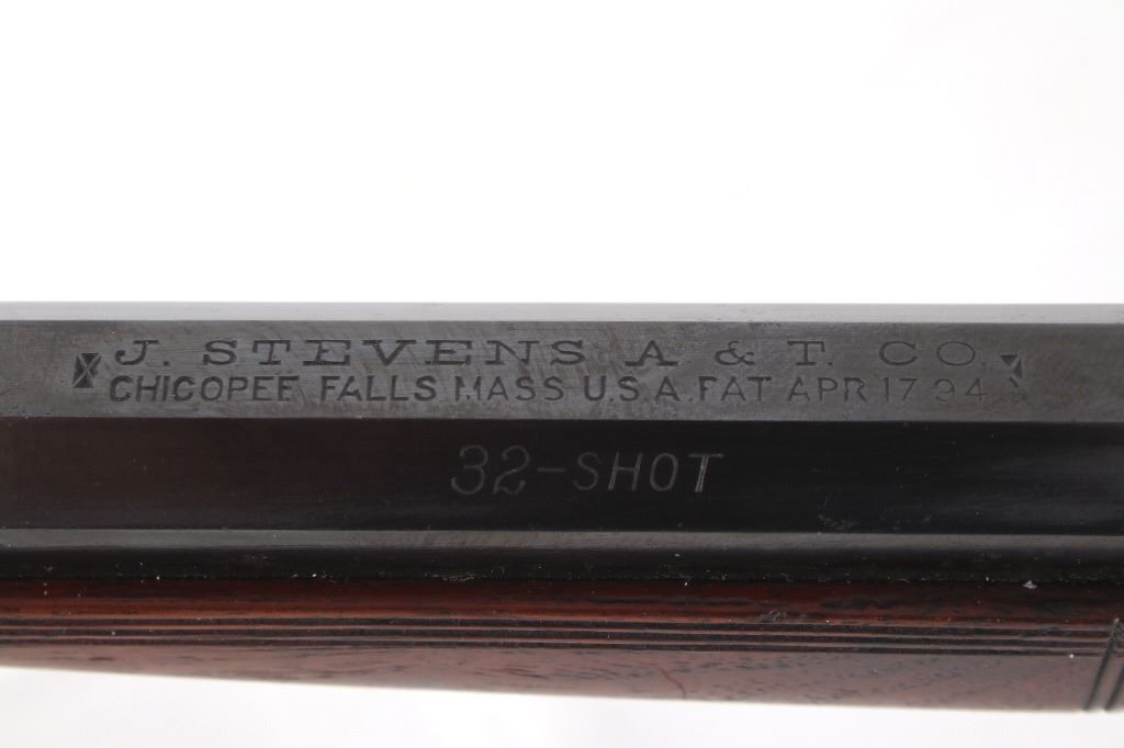 top of the receiver is correctly octagon shaped to match the barrel, but on this one, the top flat is actually fluted or concave to lower the height for sighting. Since there is no provision for a rear sight as on a rifle, one must simply look along the barrel top to the shotgun bead front sight. The 22” half octagon barrel shows a lovely deep blue and is clearly marked with the correct J. Stevens A. & T. Co., Chicopee Falls, Mass. U.S.A. markings along with the April 17, 1894 patent date. The left side of the barrel just ahead of the receiver is caliber stamped “32-SHOT.” The stock and forend are in fine