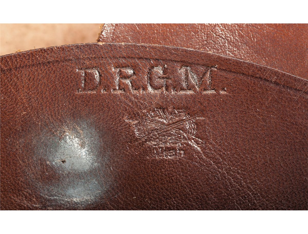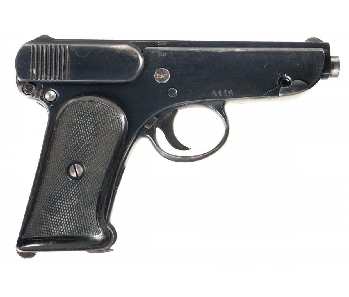 This is a very rare example of a desirable "Jager" semi-automatic pistol as produced in the 1914-1917 time frame. The unique aspect of this pistol is that the sides of the frame are actually an early form of sheet metal stamping that the rest of the parts were assembled to. The trigger guard/underside of the frame hinges at the lower front and swings downward to exposed the internal components, with some of the remaining parts being stampings combined with standard machined parts. It was estimated that approximately 12,000 were manufactured at Jager and Company, with only a handful actually being accepted by the Imperial German Army at this time. With the Imperial marked Jagers, interspersed with commercial Jagers in the 5,167 to 9,268 serial range. This example is stamped with commercial "Crown/N" proofs on the right side of the frame, upper slide and barrel cross-pin. With the left side of frame marked "JAGER-PISTOLE. D.R.P. ANGEM. This example has checkered, black plastic grips and is complete with a small unmarked brown leather holster with a side magazine pouch that contains on spare unmarked blued original magazine.