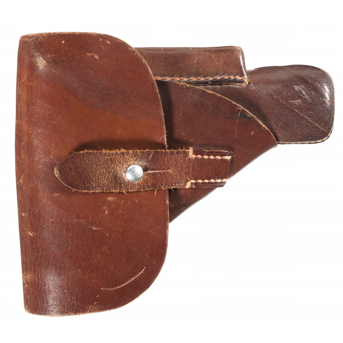 Condition: Excellent with 95% of the original pre-war rust blued finish, with edge and high spot wear overall with blue loss on the grip straps and upper rear end of the frame. There is some very minor spots of pitting on top of the left rear edge of the slide probably from sitting in a holster. The grips are in good condition with nice checkering on both sides with several minor chips or mold marks on the left side grip. The holster is in very good plus condition with nice medium brown color overall with tight stitching. A very nice example of an early "Jager" commercial semi-automatic pistol.