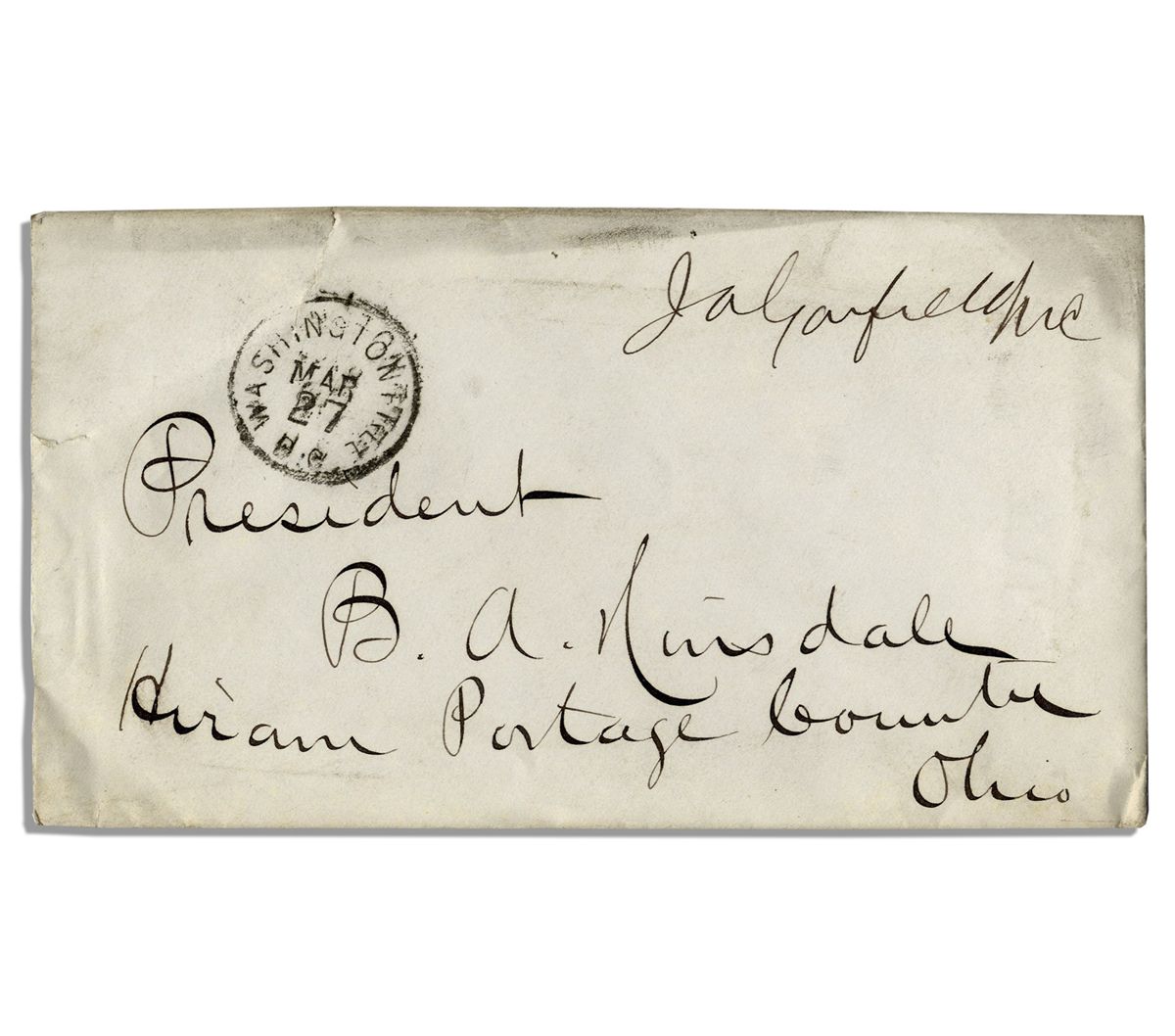 James A. Garfield's franking signature, ''JA Garfield / MC [Member of Congress]'' as an Ohio Congressman. Envelope is addressed to Garfield's close friend Burke Hinsdale as President of Garfield's alma mater, Hiram, in Portage, Ohio. With postmark of ''Washington Free / D.C. / Mar / 27''. Measures 5.57'' x 3.25''. Toning, slight tears to edges, a date notation to verso, else near fine.