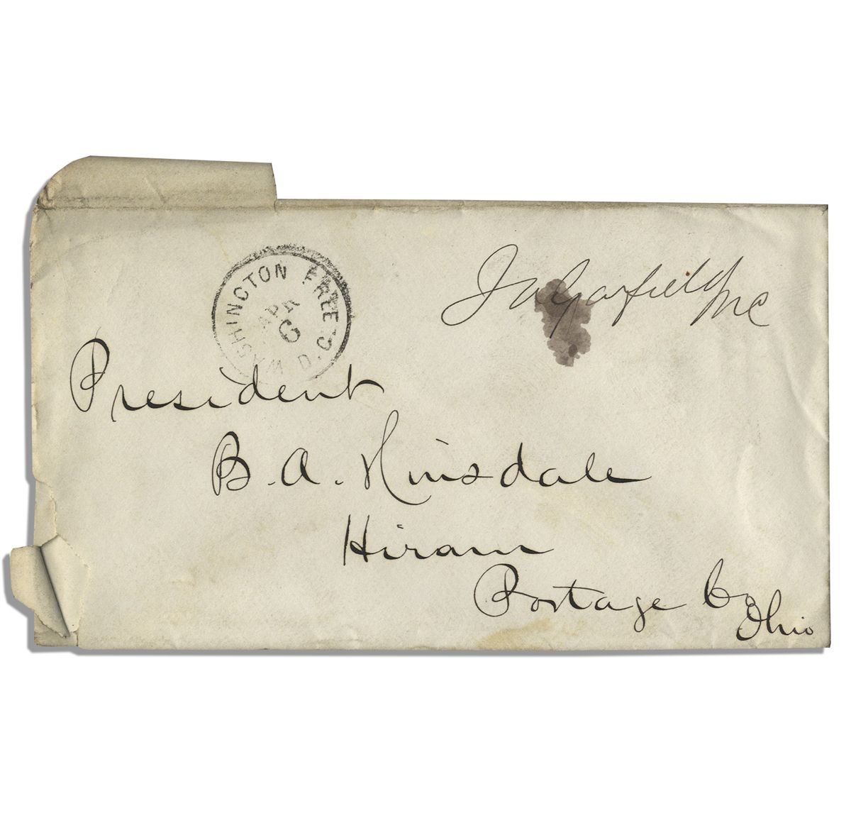 James A. Garfield's franking signature, ''JA Garfield / MC [Member of Congress]'' as an Ohio Congressman. Postmark of ''Washington Free / D.C. / Apr / 6'' dates the free frank to 1872-73. Envelope is addressed to Garfield's close friend Burke Hinsdale as President of Garfield's alma mater, Hiram, in Portage, Ohio. Measures 5.57'' x 3.25''. Toning, slight tears to edges, a date notation to verso and an ink blot touching the ''G'' in ''Garfield''. Overall very good.