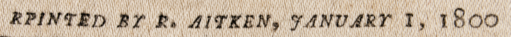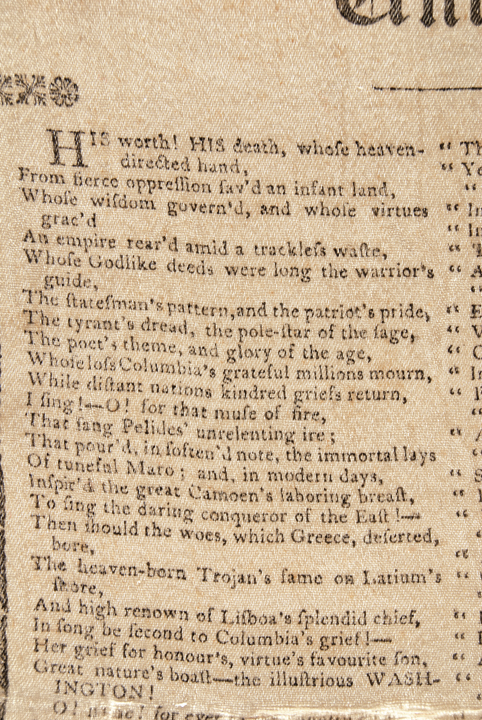 January 1, 1800-Dated, Memorial Poem Broadside Printed upon White Silk, titled “An Elegiac Poem on the Death of George Washington Commander in Chief of the Armies of the United States, Who died at Mount Vernon, Virginia, 14th December, 1799, Aged 69 years. Dedicated to the Citizens of the Unites States.”, Printed by R. Aitken (Error spelling “RPINTED”), “Threads of History” Item 18 on page 56, Fine.