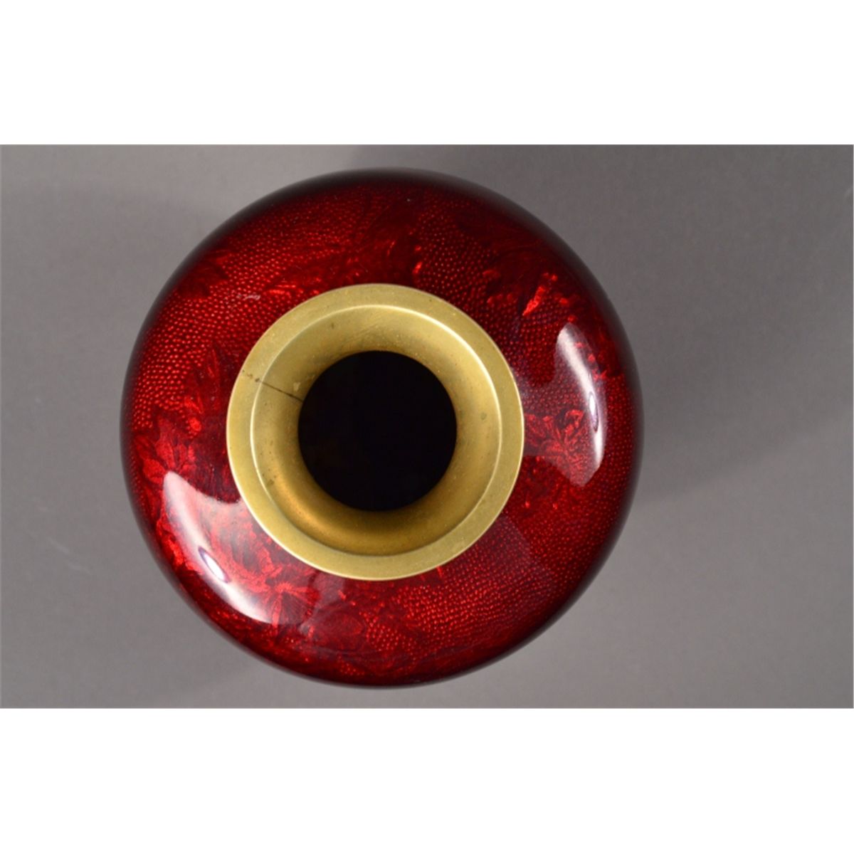Rare Japanese Translucent red glazed copper vase with relief and incised design, 19th Century; 6 1/4" tall, 4 1/2" diameter