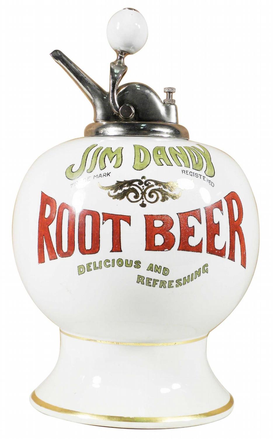 Rare Jim Dandy Root Beer Syrup Dispenser. Contemporary pump. No chips or cracks, excellent condition. 9 inch diameter X 15 inches tall.